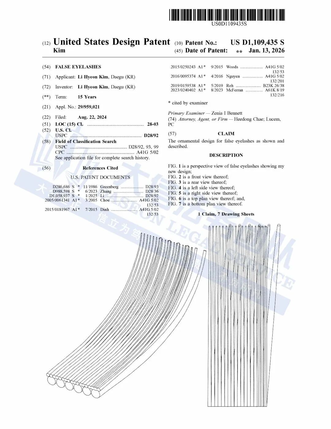 除此之外,就在26年刚开年,1月13日,有两款假眼睫毛拿到美国的外观专利证书,一个是是韩国人Li Hyeon Kim(USD1109435S),另一个国内企业(USD1109434S)