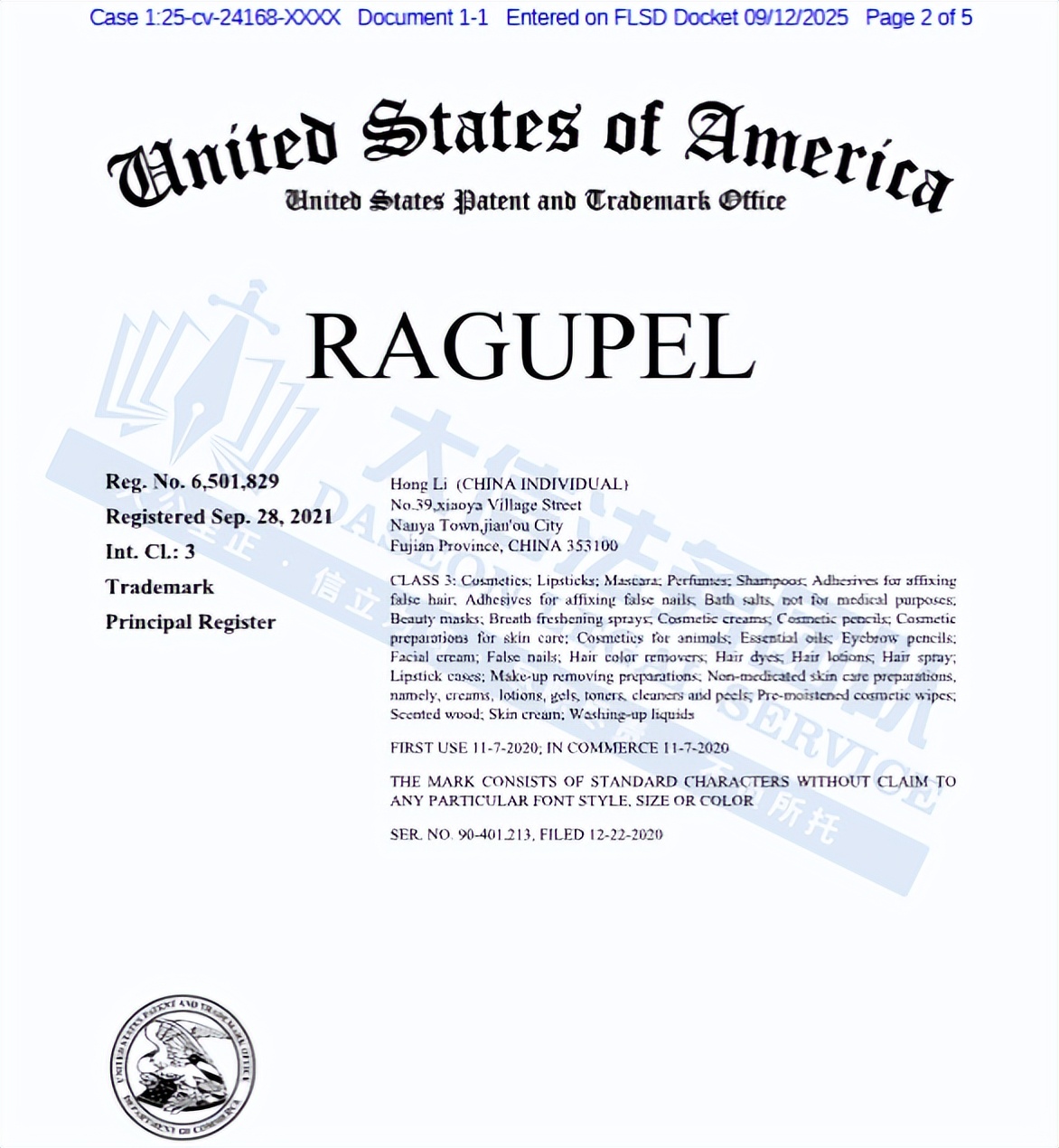 RAGUPEL这个商标注册在第3大类,保护范围大到离谱:化妆品、护肤品、美甲工具、假发粘合剂、假指甲粘合剂、非医用浴盐、面霜、乳液……甚至连洗洁精都包含在内。