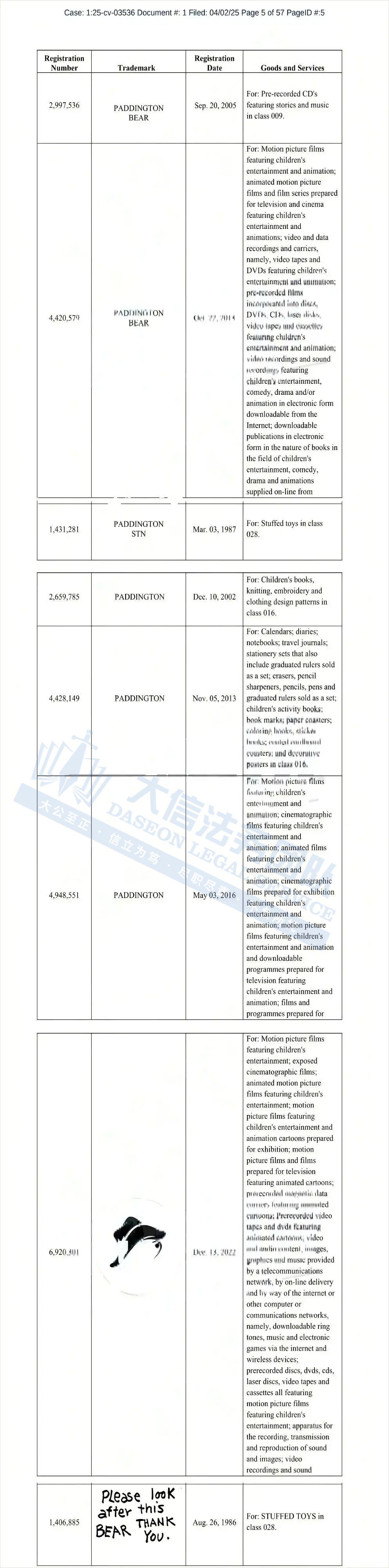 此案为商标维权,涵盖文具、家居用品、毛绒玩具、纺织用品、游戏、电影、咖啡、填充玩具等多个领域,以下是商标的具体信息,跨境卖家尽快检索下架,避免造成TRO侵权损失!