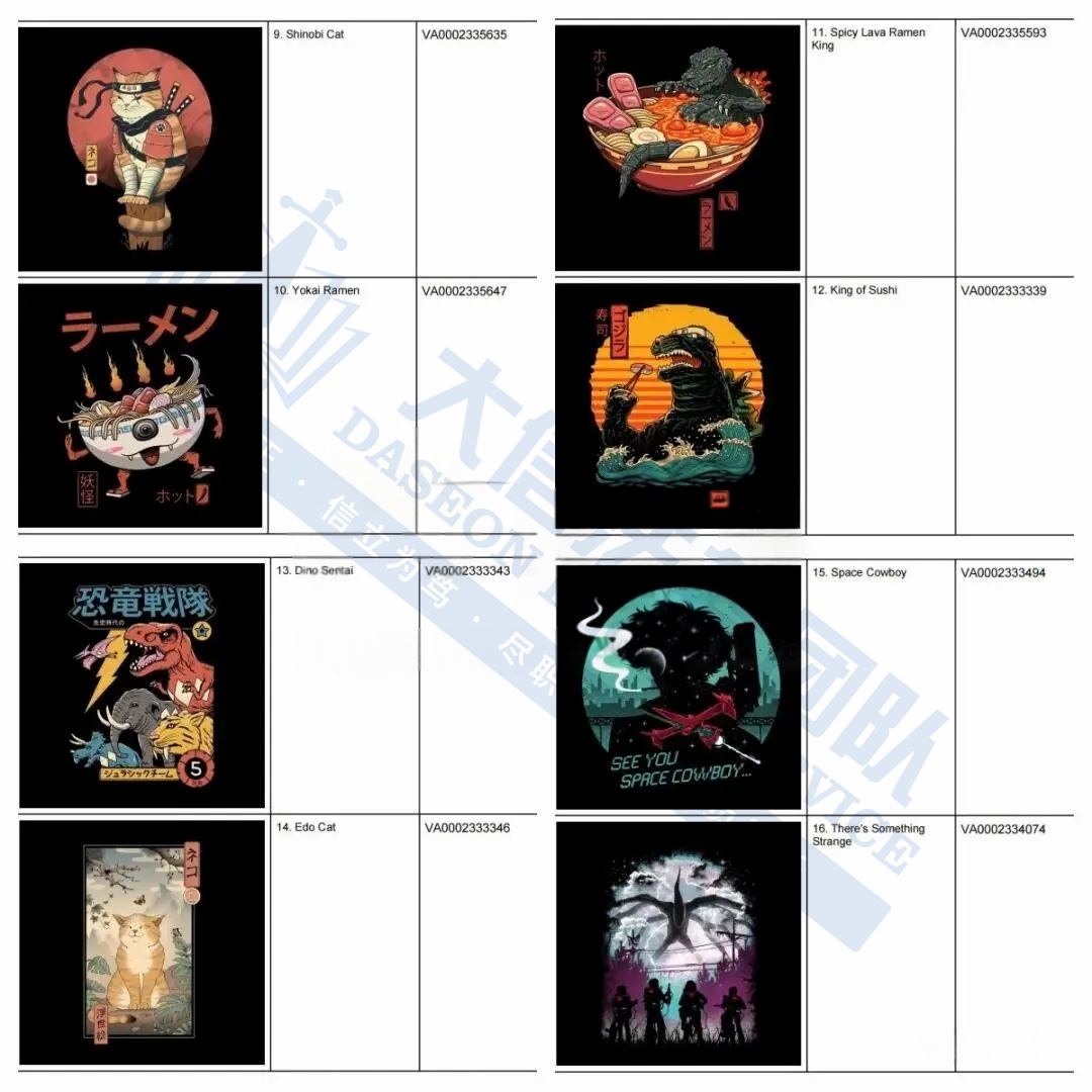 此案为版权维权,涉及21张版权图,值得注意的是,原告在美国注册了多达110张版权图片,在23年,24年多次发起TRO维权,除此之外,官网的其他作品未经授权均不得擅自使用,以下是涉及版权具体信息,未经授权不得擅自使用,侵权风险极高,跨境卖家尽快检索下架,避免造成更大的TRO侵权损失!