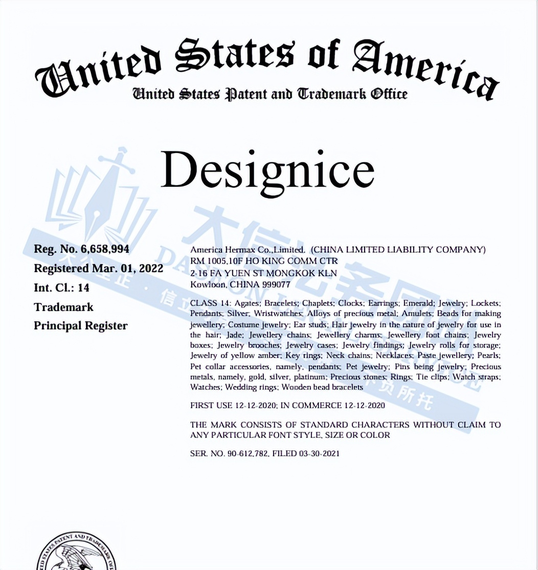 此案为商标维权,涉及DESIGNICE商标,于2022年3月1日在美国注册,商标号:6,658,994。以下是涉及商标的具体信息,未经授权不得擅自使用,侵权风险极高,跨境卖家尽快检索下架,避免TRO侵权风险!