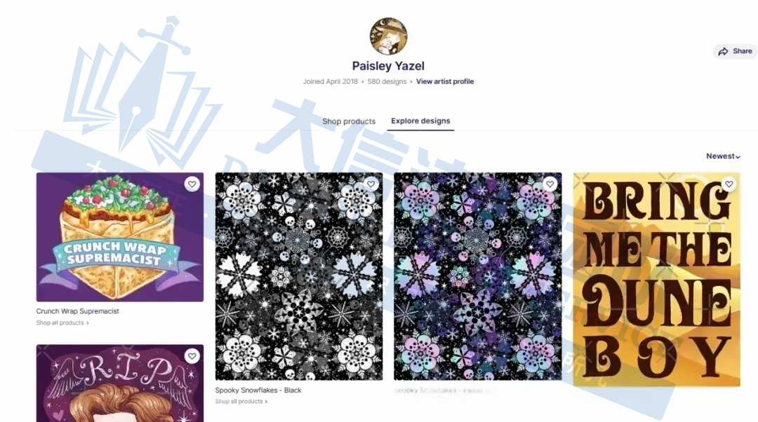 原告Paisley Yazel 是印第安纳州北部活跃的插画家及设计师,也是 Yazel Media LLC 的联合创始人兼核心艺术家,作品以“温馨恐怖”为创作哲学,将宗教符号、鬼屋意象、北美荒野传说与叛逆幽默熔铸成一场视觉悖论,她的创作灵感来源于宗教符号的神秘感、鬼屋的奇幻氛围、西部民间传说的浪漫,北美荒野的原始气息,再综合黑色幽默,形成了其独特的艺术表达。