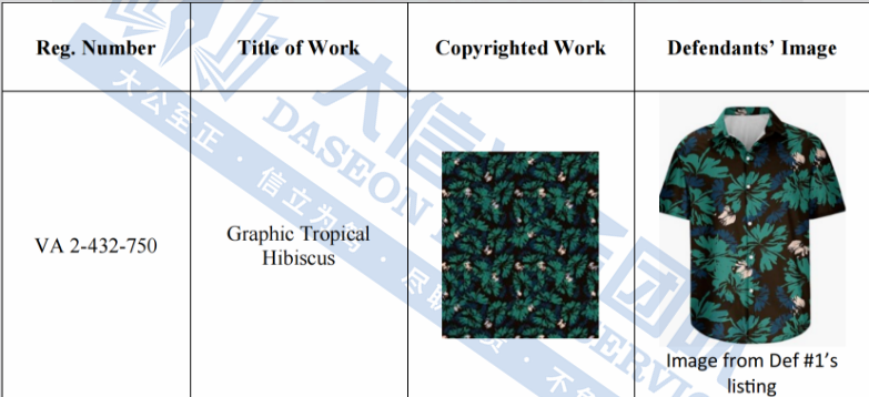 此案为版权维权,目前有67家店铺被波及,涉及《Graphic Tropical Hibiscus Work》(热带木槿图形),于2025年1月14日下证,版权号为 VA 2-432-750,以下是涉及版权的具体信息,未经授权不得擅自使用,侵权风险极高,跨境卖家尽快检索下架,避免TRO侵权风险!