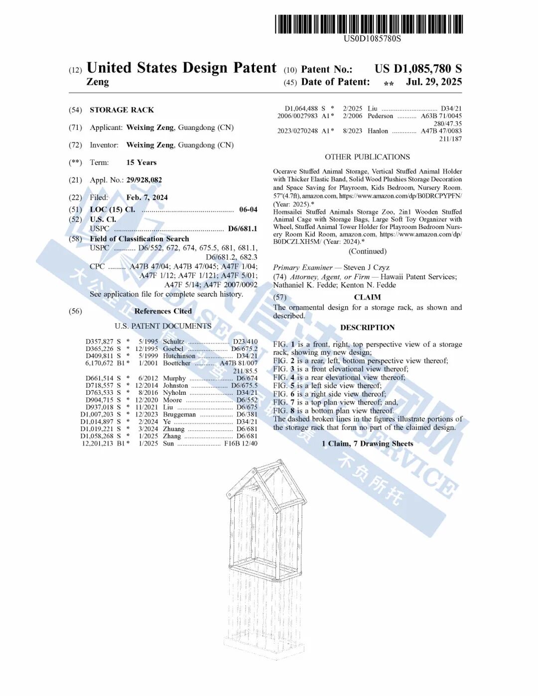 此案为专利维权,涉及2项设计专利作品,专利号:D1085780和D1107472,分别于2025年7月和12月下证,以下是涉及专利的具体信息,未经授权不得擅自使用,侵权风险极高,跨境卖家尽快检索下架,避免TRO侵权风险!