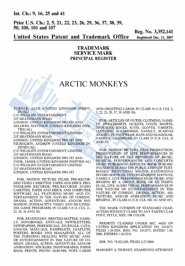 此案为商标维权,涉及1个文字商标ARCTIC MONKEYS,商标号:NO.3352141等。以下是涉及商标的具体信息,未经授权不得擅自使用,侵权风险极高,跨境卖家尽快检索下架,避免TRO侵权风险!