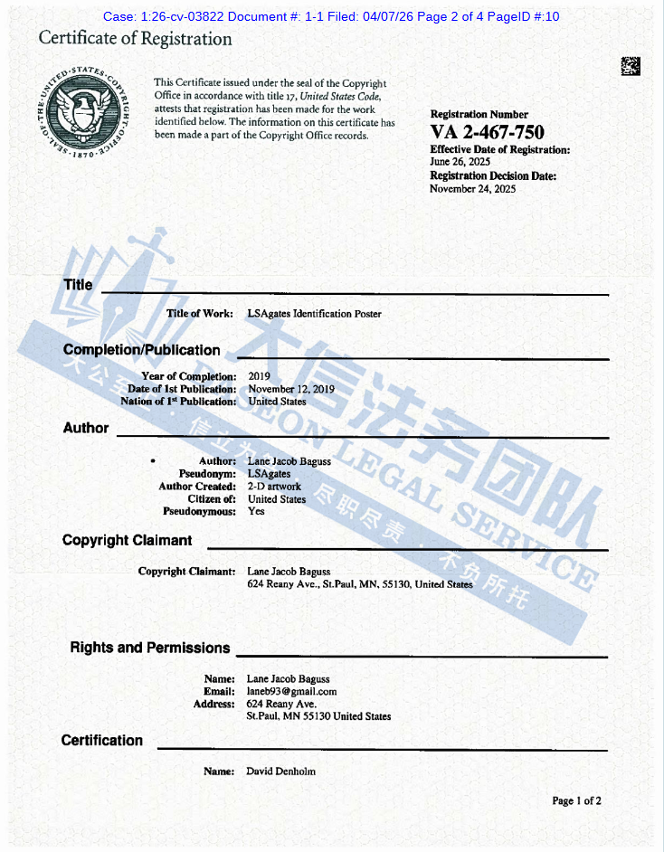 本案为版权侵权,涉及原告的原创艺术作品《LSAgates Identification Poster》苏必利尔湖玛瑙识别海报,版权号:VA 2-467-750。以下是涉及版权的具体信息,未经授权不得擅自使用,侵权风险极高,跨境卖家尽快检索下架,避免TRO侵权风险!