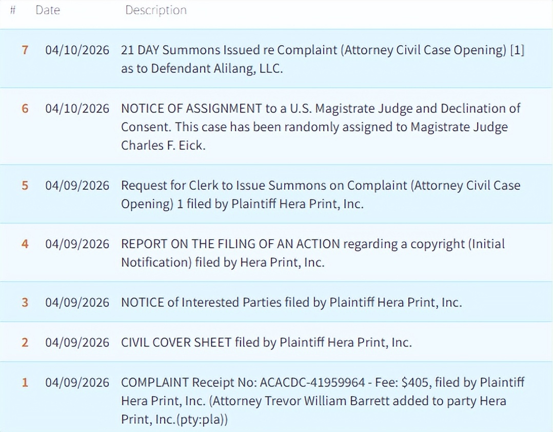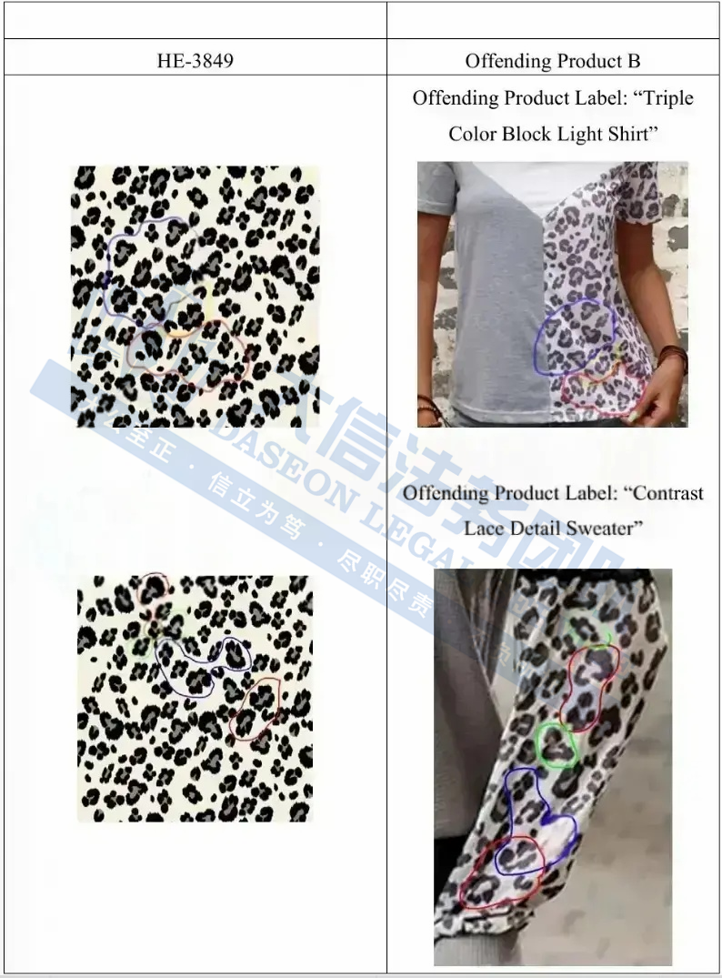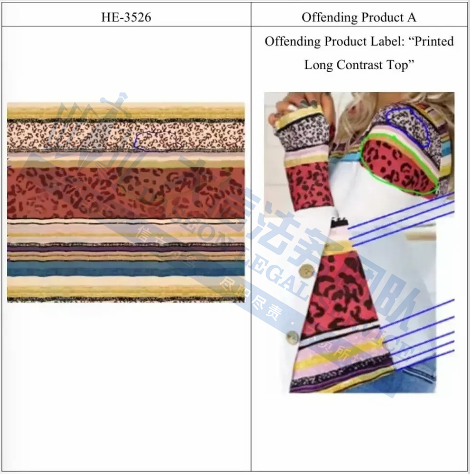 本案为版权侵权,涉及原告HE-3526、HE-3849和HE-3944等3个印花版权作品。以下是涉及版权的具体信息,未经授权不得擅自使用,侵权风险极高,跨境卖家尽快检索下架,避免TRO侵权风险!