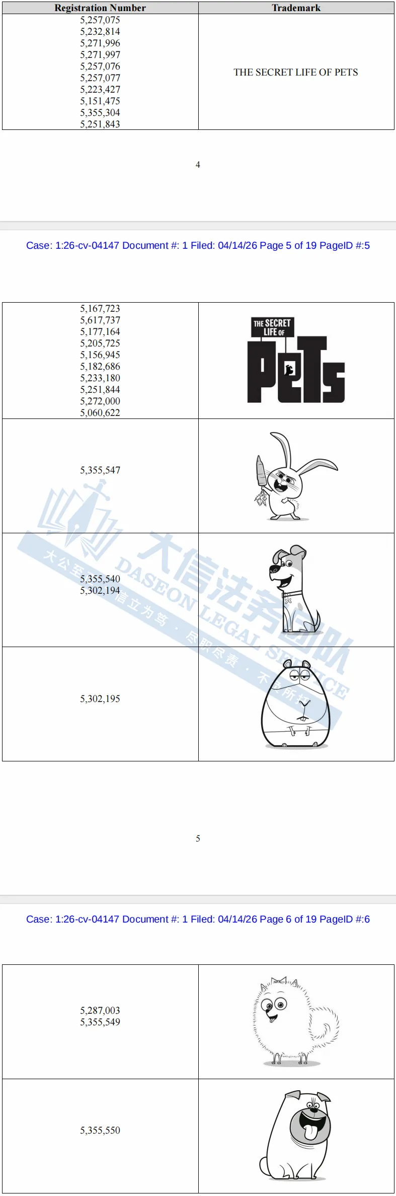 本案是爱宠大机密商标和版权的双重维权,版权号:PA0001992458、PA0002056841、PA0002177286以及TX0008438283,涉案商标涵盖The Secret Life of Pets文字商标以及图形商标。以下是涉及版权的具体信息,未经授权不得擅自使用,侵权风险极高,跨境卖家尽快检索下架,避免TRO侵权风险!