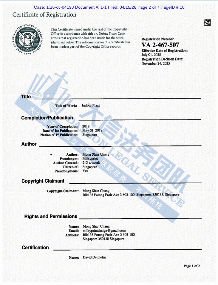 本案为版权侵权,涉及原告3幅插画版权,版权号:VA2453706、VA2453708和VA2453704。以下是涉及版权的具体信息,未经授权不得擅自使用,侵权风险极高,跨境卖家尽快检索下架,避免TRO侵权风险!