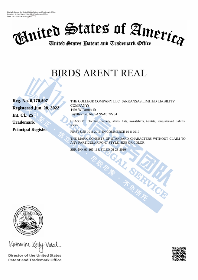 原告 The College Company LLC是2017 年成立的私人有限责任公司。“BIRDS AREN’T REAL” 为大学生发起的讽刺性运动,以幽默、病毒式传播内容,嘲讽虚假信息及盲从不实言论的社会现象。该主体已在第 25 类服装鞋帽商品上成功注册商标,核定使用商品包含衬衫、帽子、卫衣、T 恤、长袖 T 恤、袜子等。