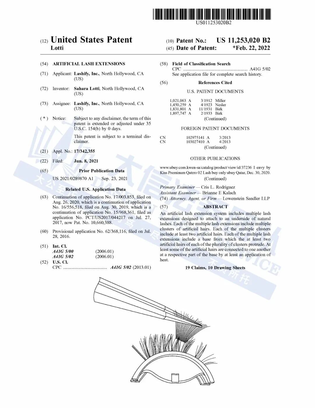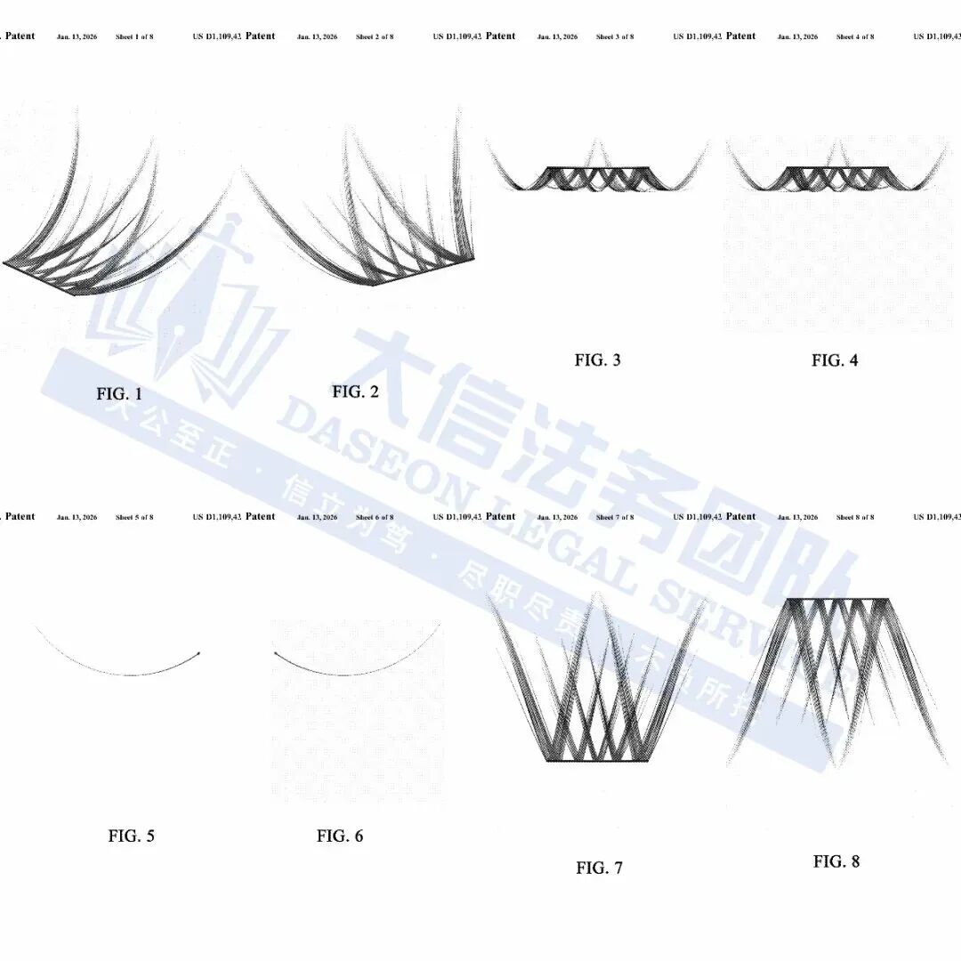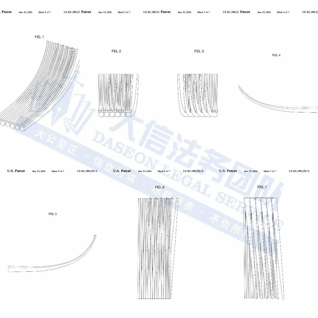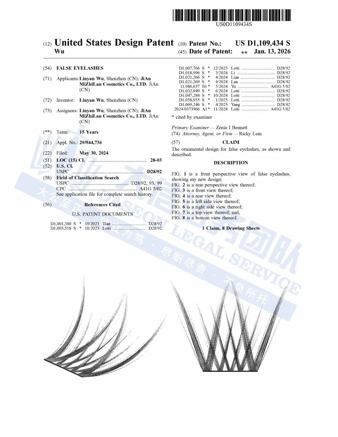 除此之外,就在26年刚开年,1月13日,有两款假眼睫毛拿到美国的外观专利证书,一个是是韩国人Li Hyeon Kim(USD1109435S),另一个国内企业(USD1109434S)
