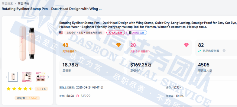 数据显示,上线仅3个多月,某跨境店铺的这款眼线印章笔已卖出18.26万件,总GMV超过164.61万美元(约合人民币1151万元)。