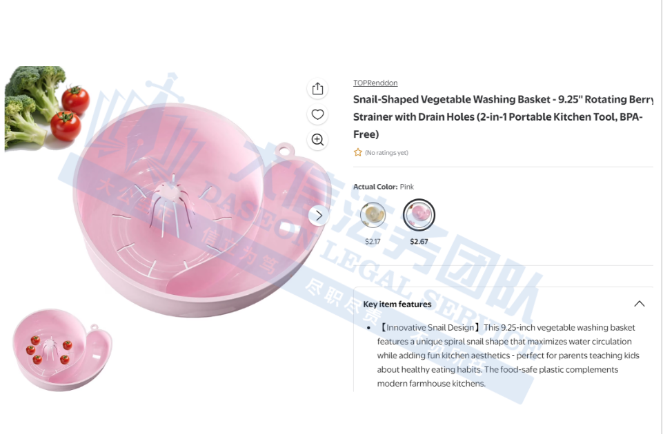 此案为版权维权,涉及数十张蜗牛沥水篮版权,版权号:VAu 1-564-602,于2025年8月26日下证,以下是涉及版权的具体信息,跨境卖家尽快对照下架,未经授权不得擅自使用,侵权风险极高!