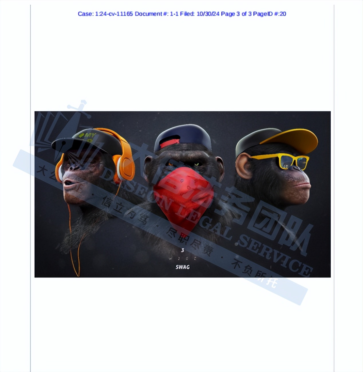原告Juliano Dos Santos De Araujo是一名数字艺术家和设计师,他创作了灵感来自于日常生活和嘻哈文化的当代作品。他拥有平面设计学士学位,他在大学期间就对3D艺术产生了热情。他的愿望是,他的作品能继续得到有信誉的公司和画廊的认可和认可。Three Wise Monkeys寓意为不见恶事,不闻恶词,不言恶言这三个寓意共同构成了版权作品的核心价值,表达希望通过自我控制和约束,保持内心的善良和纯净。