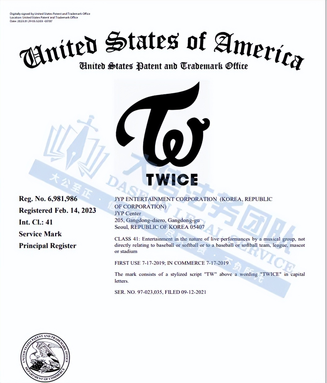 此案为商标维权,涉及3个TWICE图文商标,商标人是JYP,其商标的产品服务范围分别服饰、鞋类、商业服务等,以下是涉及商标的具体信息,除此之外,官网上的其他作品未经授权不得擅自使用,侵权风险极高,跨境卖家尽快检索下架,避免TRO侵权风险!