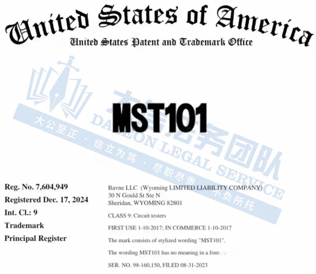 此案为商标维权,涉及MST101商标,于 2024 年12 月注册,商标号:7604949。以下是涉及商标的具体信息,未经授权不得擅自使用,侵权风险极高,跨境卖家尽快检索下架,避免TRO侵权风险!