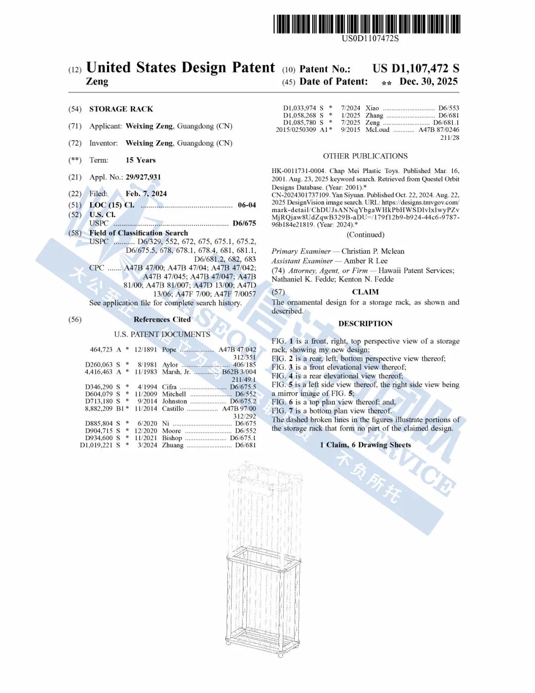 此案为专利维权,涉及2项设计专利作品,专利号:D1085780和D1107472,分别于2025年7月和12月下证,以下是涉及专利的具体信息,未经授权不得擅自使用,侵权风险极高,跨境卖家尽快检索下架,避免TRO侵权风险!