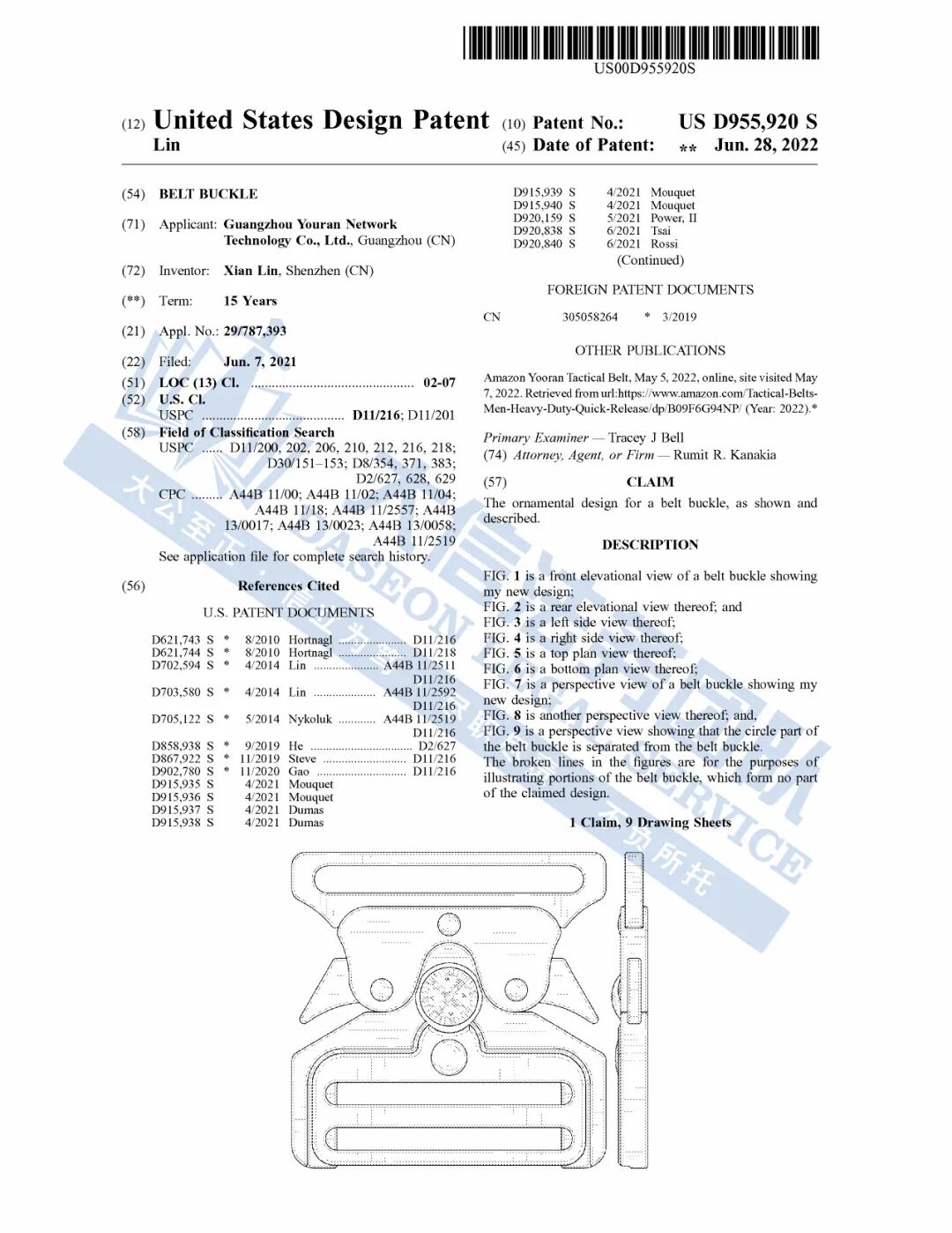 此案为专利维权,涉及2项外观专利作品,专利号:D955920和D922252,以下是涉及专利的具体信息,未经授权不得擅自使用,侵权风险极高,跨境卖家尽快检索下架,避免TRO侵权风险!