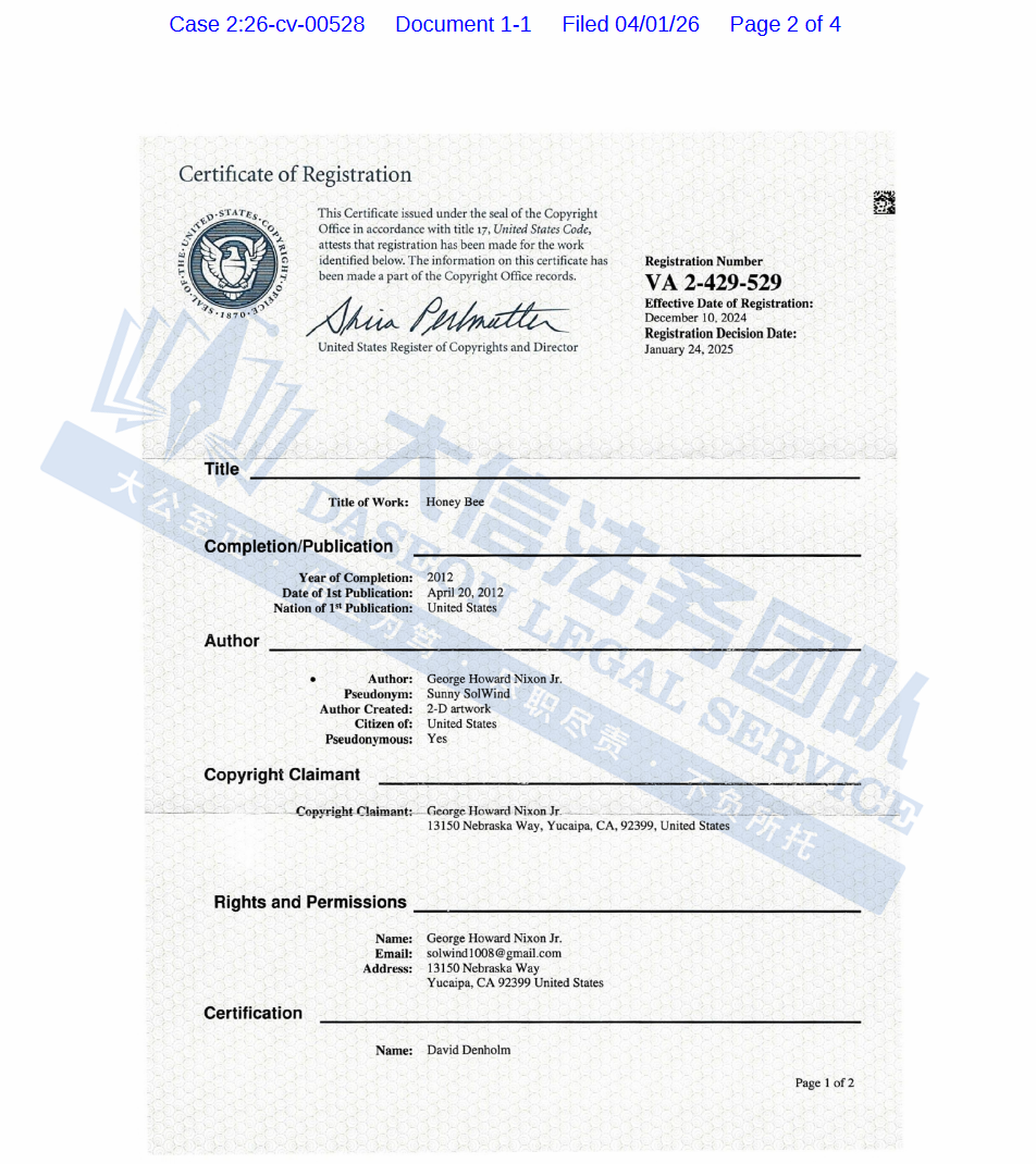 此案为版权侵权,涉及1张版权图Honey Bee,注册号:VA 2-429-529,于24年生效。以下是涉及版权的具体信息,未经授权不得擅自使用,侵权风险极高,跨境卖家尽快检索下架,避免TRO侵权风险!