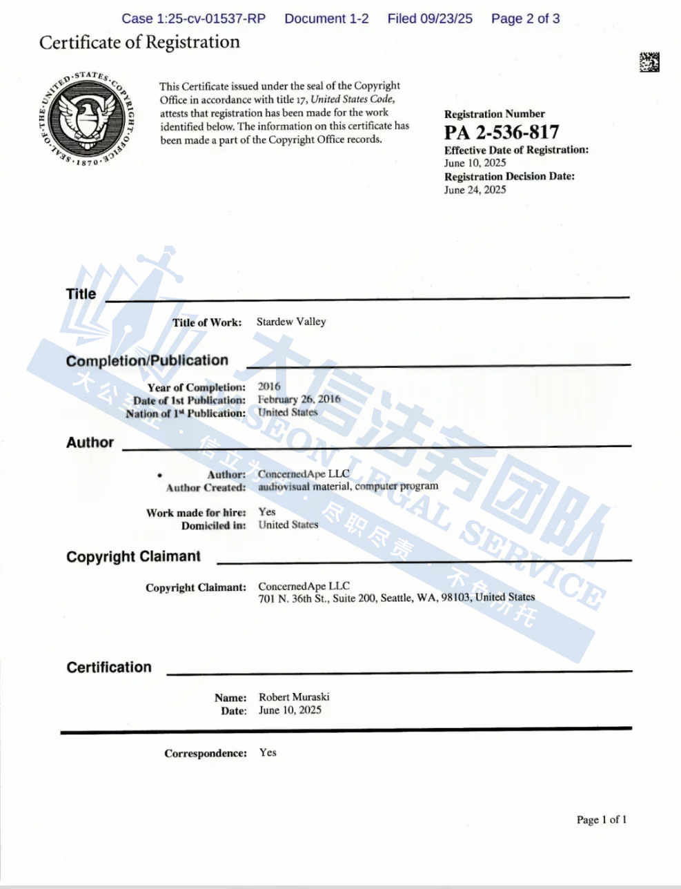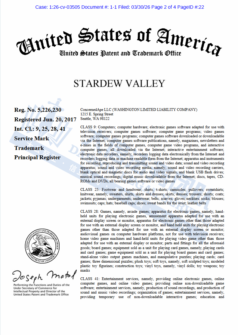 此案为商标和版权的双重维权,覆盖所有使用“Stardew Valley”商标及相关版权元素的产品,商标号:5226230,版权号:PA2536817。以下是涉及商标和版权的具体信息,未经授权不得擅自使用,侵权风险极高,跨境卖家尽快检索下架,避免TRO侵权风险!