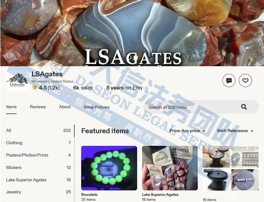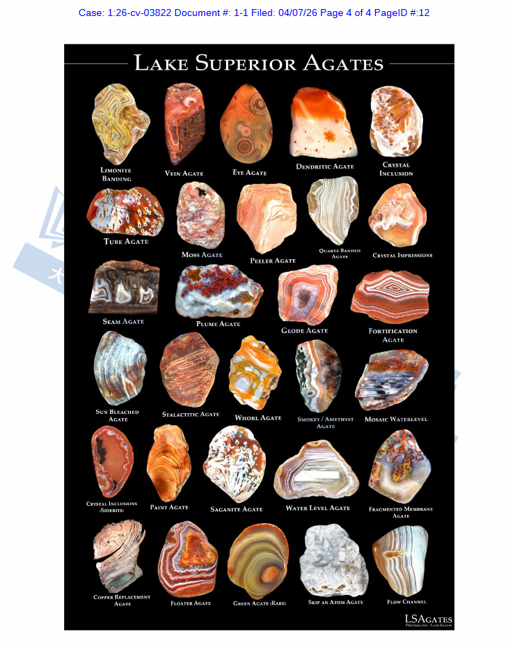 本案为版权侵权,涉及原告的原创艺术作品《LSAgates Identification Poster》苏必利尔湖玛瑙识别海报,版权号:VA 2-467-750。以下是涉及版权的具体信息,未经授权不得擅自使用,侵权风险极高,跨境卖家尽快检索下架,避免TRO侵权风险!
