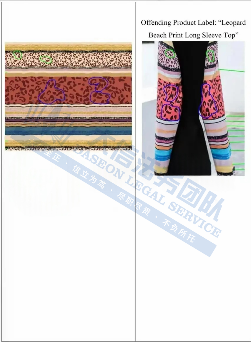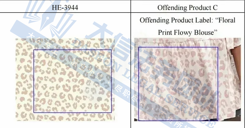 本案为版权侵权,涉及原告HE-3526、HE-3849和HE-3944等3个印花版权作品。以下是涉及版权的具体信息,未经授权不得擅自使用,侵权风险极高,跨境卖家尽快检索下架,避免TRO侵权风险!