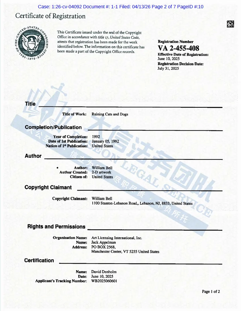 本案为版权侵权,涉及原告2幅版权画,版权号:VA 2455408和VA2455405。本案共有25家店铺被波及,以下是涉及版权的具体信息,未经授权不得擅自使用,侵权风险极高,跨境卖家尽快检索下架,避免TRO侵权风险!