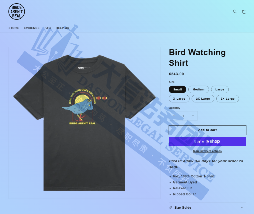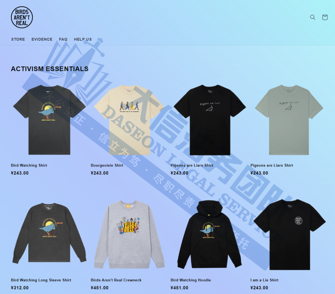 原告 The College Company LLC是2017 年成立的私人有限责任公司。“BIRDS AREN’T REAL” 为大学生发起的讽刺性运动,以幽默、病毒式传播内容,嘲讽虚假信息及盲从不实言论的社会现象。该主体已在第 25 类服装鞋帽商品上成功注册商标,核定使用商品包含衬衫、帽子、卫衣、T 恤、长袖 T 恤、袜子等。