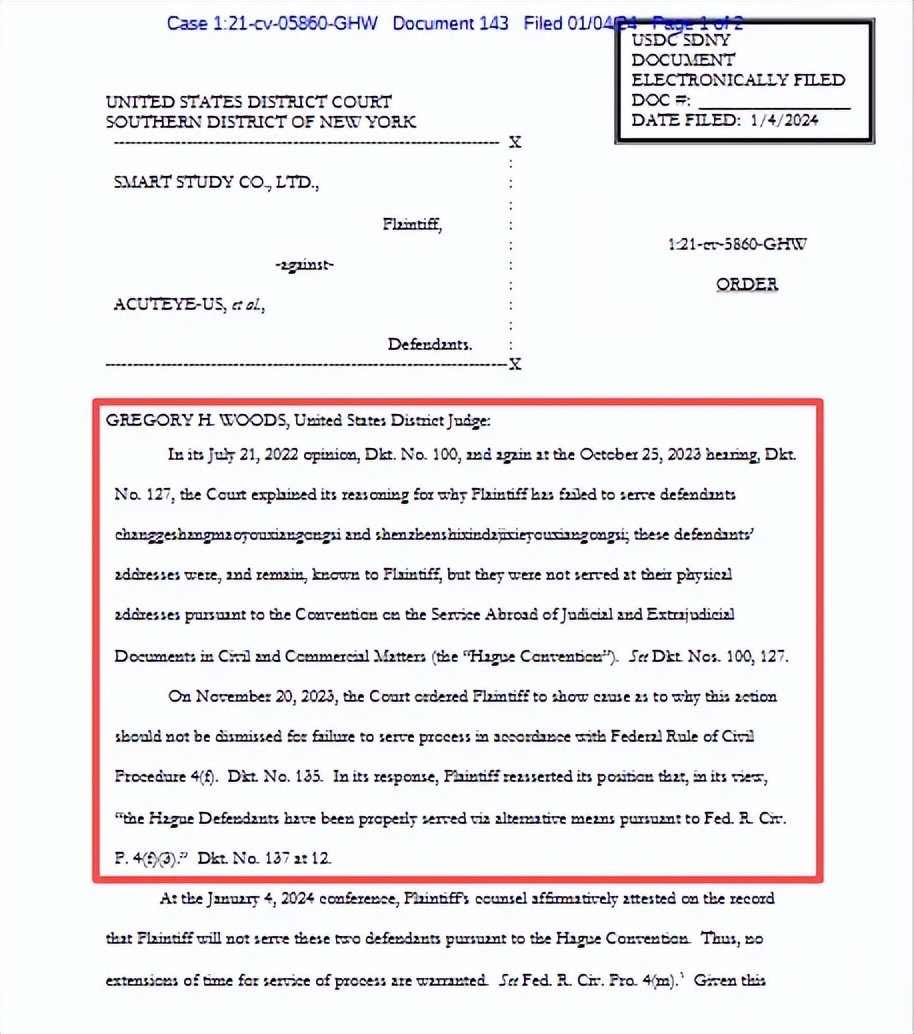其中两名被告提出抗辩,认为美国法院缺乏属人管辖权,理由是通过电子邮件向中国被告送达违反《海牙送达公约》,也不符合《联邦民事诉讼规则》第4(f)条的规定。