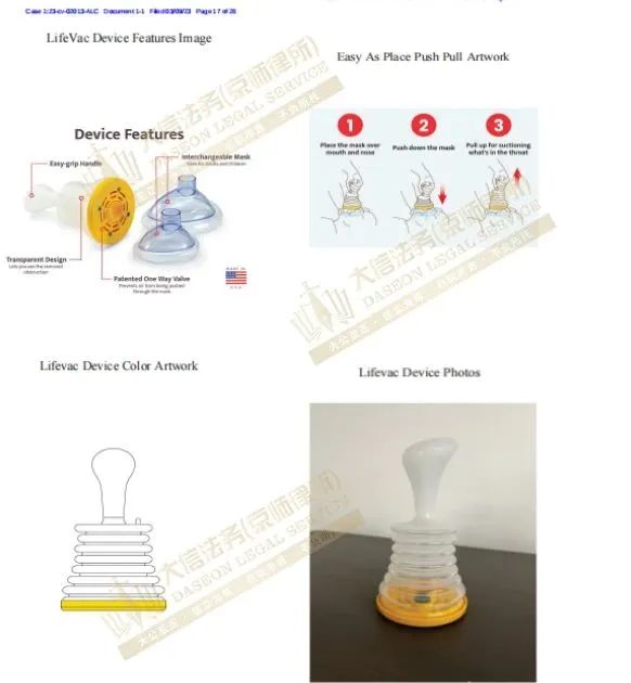 立案时间:2023-03-09 原告Life Vac LLC公司位于在纽约州斯普林菲尔德花园,他们主要是研发及生产呼吸道清理设备,如患者因呼吸道异物堵塞,导致无法呼吸时,可以利用原告的产品快速吸出呼吸道异物,产品套件适用于儿童和成人。