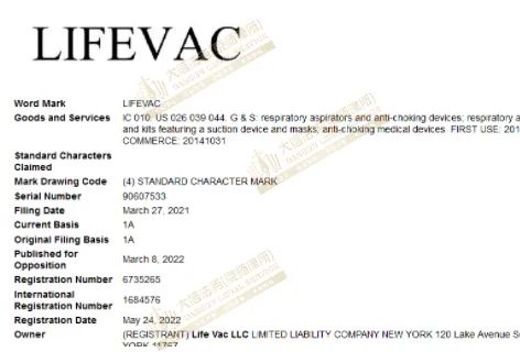 案例一:Life Vac便携式窒息救援设备商标+版权