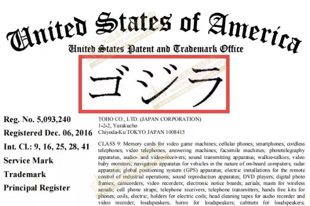 案件涉及商标主要为哥斯拉的英文和日文名称:Godzilla,ゴジラ,