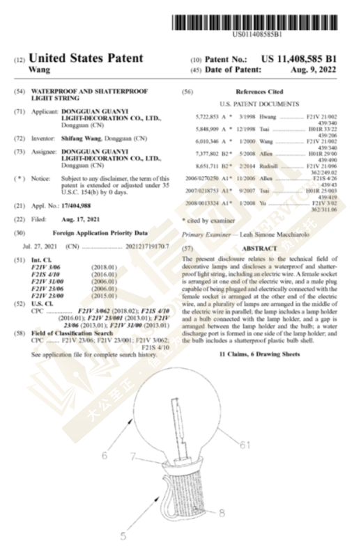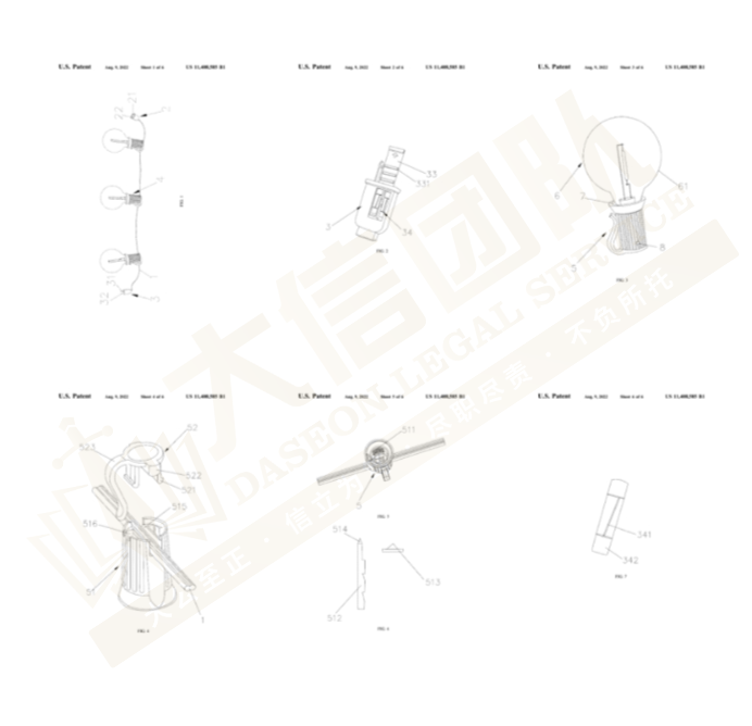 本案涉及的是一项美国发明专利US11408585,保护防水防碎灯串的发明原理。本案为专利侵权,即使产品外观不一致,也有可能涉及侵权。