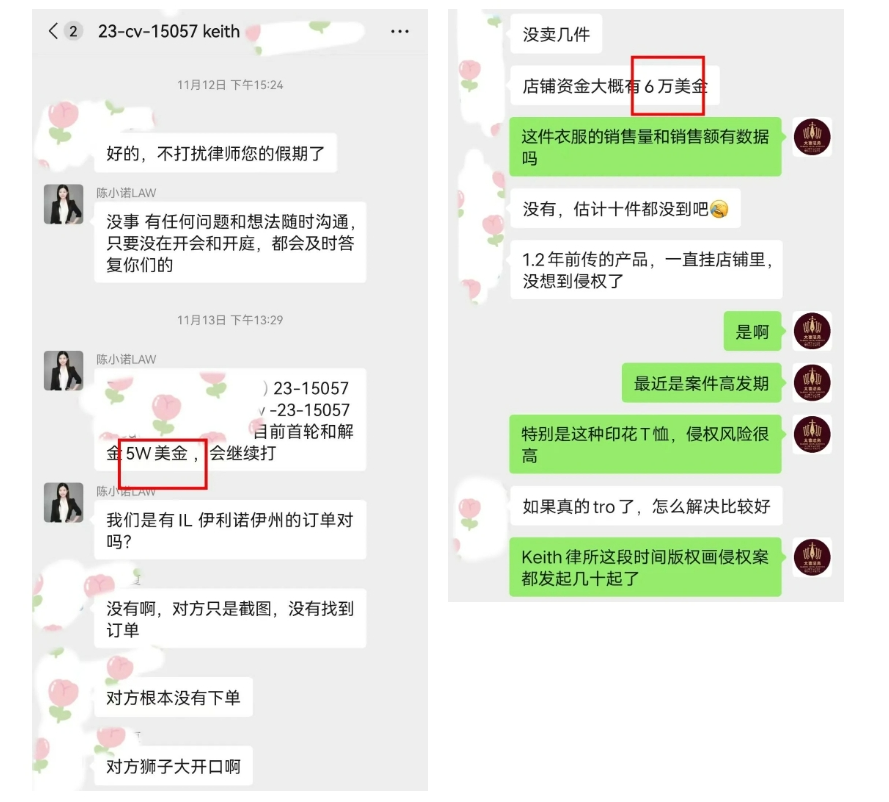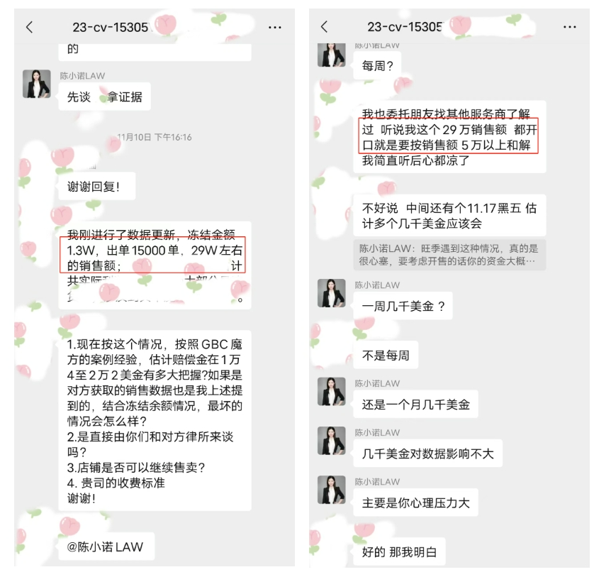 大信法务团队近期接手了不少大额疑难杂症,秉承着客户利益至上的原则,最大限度的减少了卖家的损失。无论行业如何发展,大信法务团队始终坚持初心,用心做最优质的的法律服务,希望能为跨境电商法律服务行业的健康发展添砖加瓦。 第一个案例 GBC律所代理的23-cv-15305案件。卖家侵权销售额高达29W美金,被冻结金额1.3W美金。卖家委托朋友找其他服务商了解到,需要34W美金以上的和解金。经过我们的多轮博弈,为卖家减少了32W美金以上的损失。 第二个案例 GBC律所代理的23-cv-3609案件,卖家找其他服务商经过四轮谈判,GBC始终要价6.5W美金和解金,交给我们二次处理后,经过陈律师和我们团队对于案情的专业把控,据理力争,将和解金降到了1W美金。