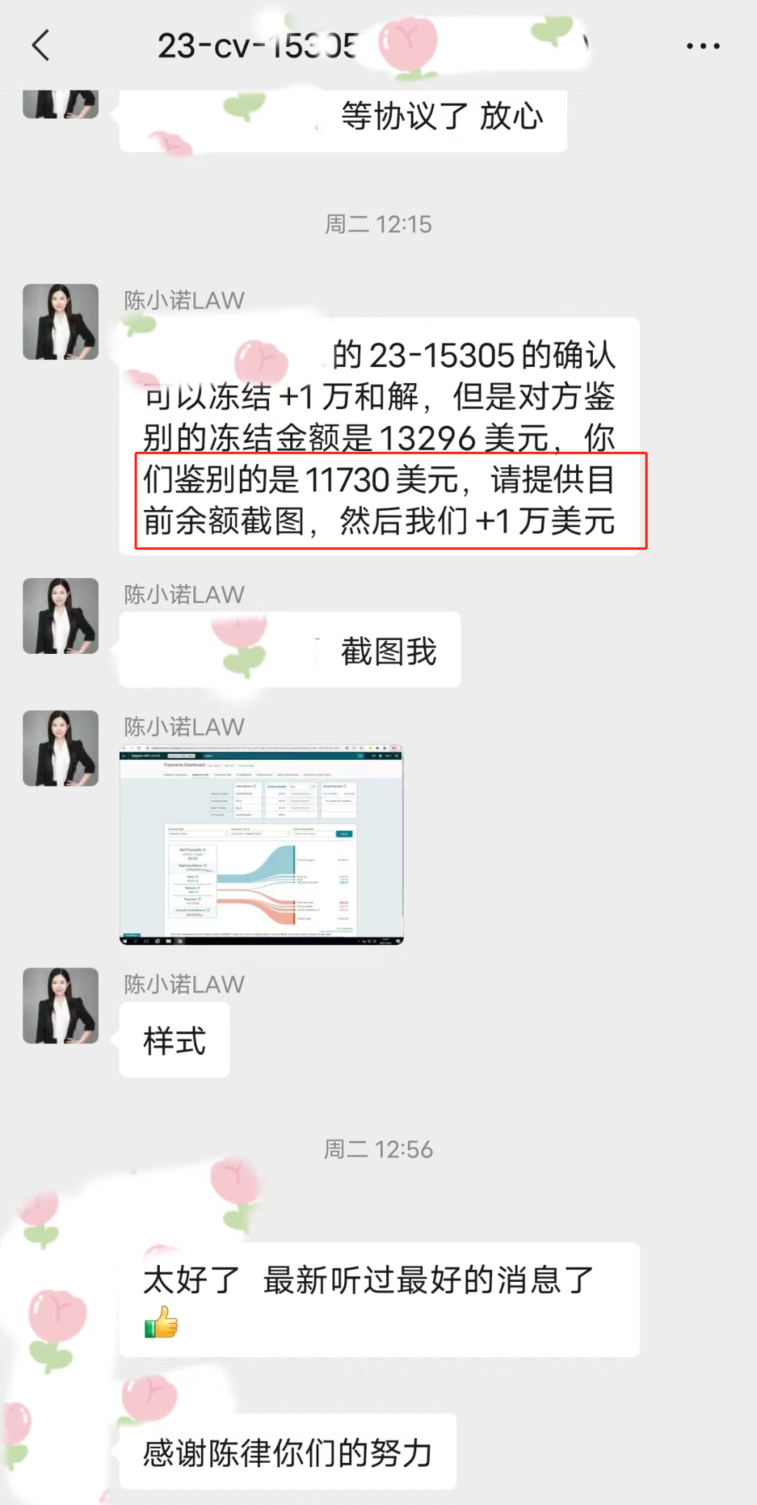 Keith律所代理的23-cv-15129案件,冻结6W美金,在陈律师和团队的全力争取下,达成了1W美金和解。和解金低至被冻金额的13%。