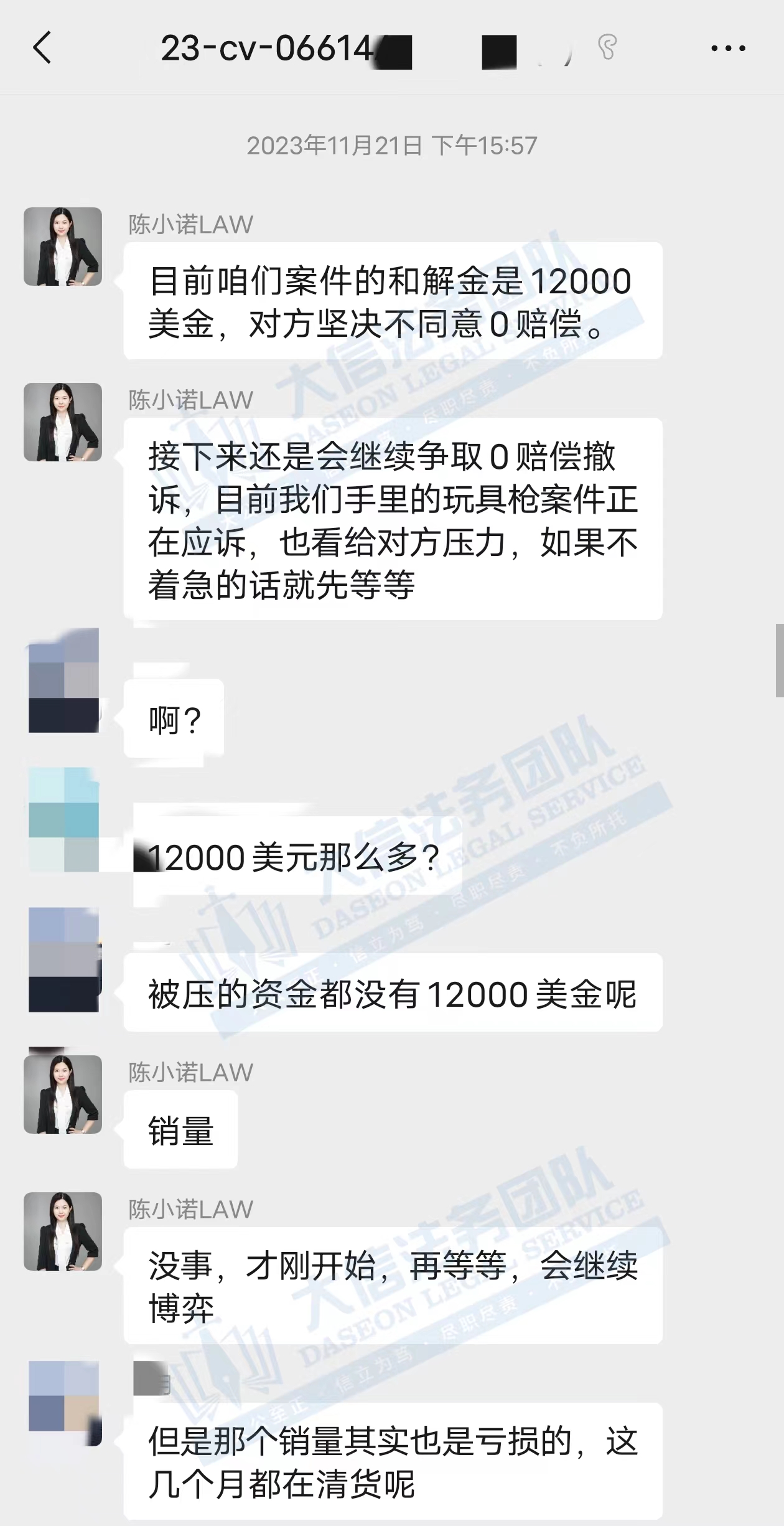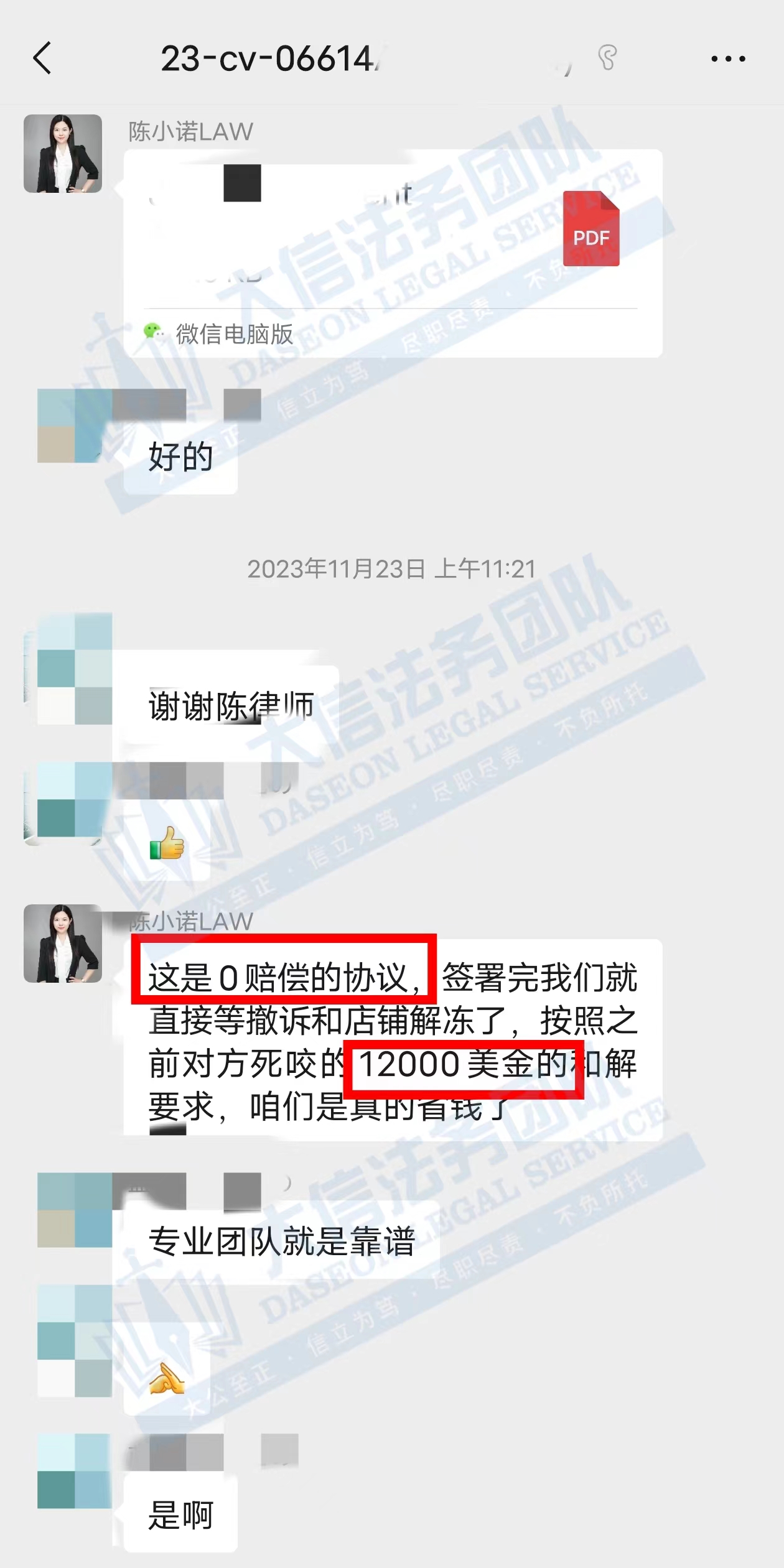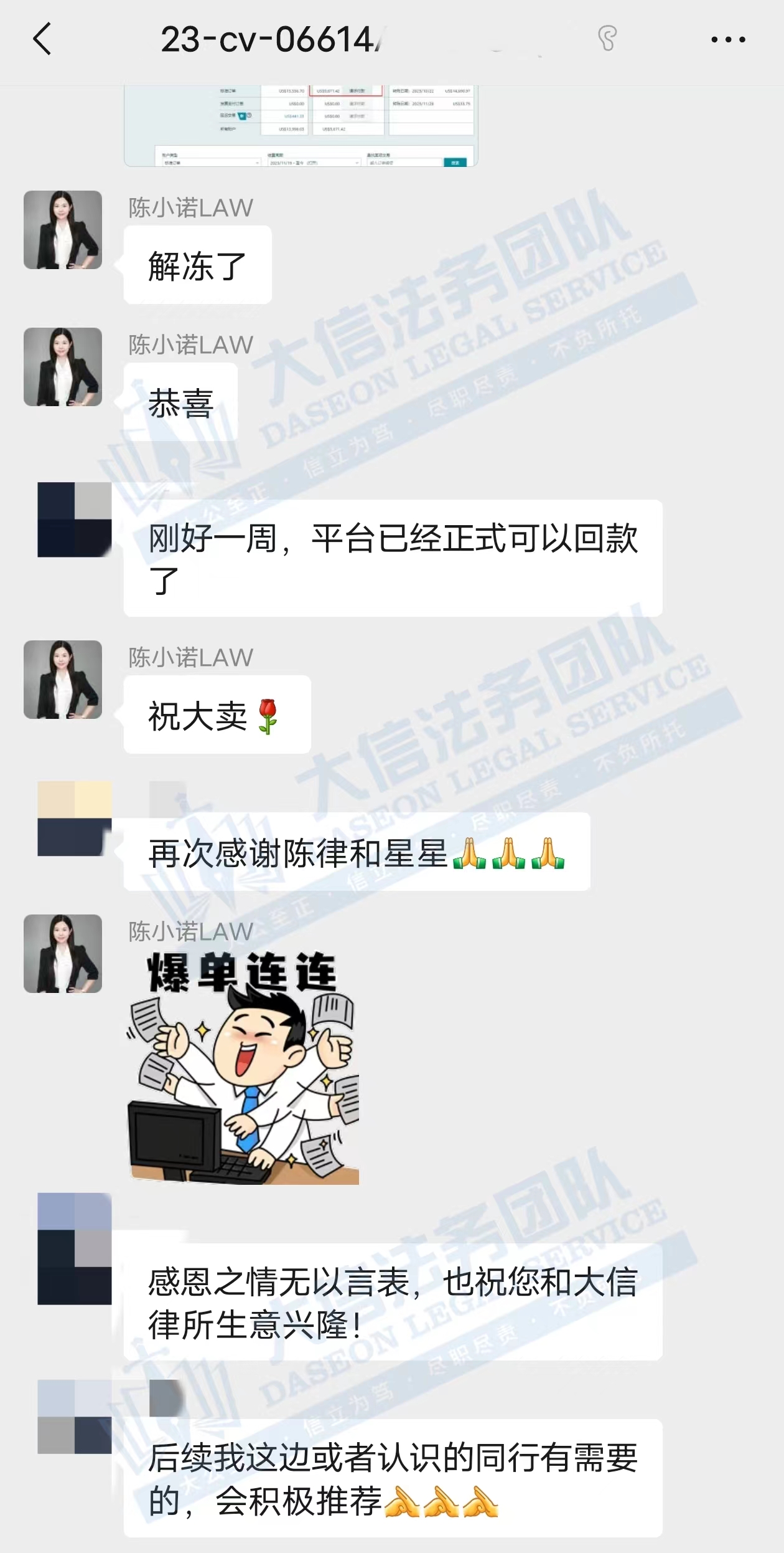 本案于8.30日起诉,但是一直处于隐匿状态,最近开始大批量冻结卖家 卖家找到大信法务团队处理后,积极配合,其他客户手里掌握了重要证据,积极应诉,在卖家的配合和大信法务团队律师的共同努力下,最终惠及小卖,一起零赔偿撤诉,部分卖家早早妥协,但是我们坚持维护卖家的利益,不该给的钱一份也不给,最终取得重大胜利! 从12000美金和解金到0赔偿和解,仅用12天! 我们始终坚信,法律服务没有捷径,容不得任何滥竽充数的行为。大信法务团队有中美资深律师,在美国TRO诉讼行业深耕多年,处理过上千起TRO侵权案,致力于为中国跨境电商卖家保驾护航! 大信法务团队-美国TRO应诉和解 专注店铺大额资金冻结、疑难杂症的案子; 专注同行解决不了、缺席判决的案子; 专注多次谈判博弈无法和解的案子。 致力于为中国跨境电商卖家保驾护航!