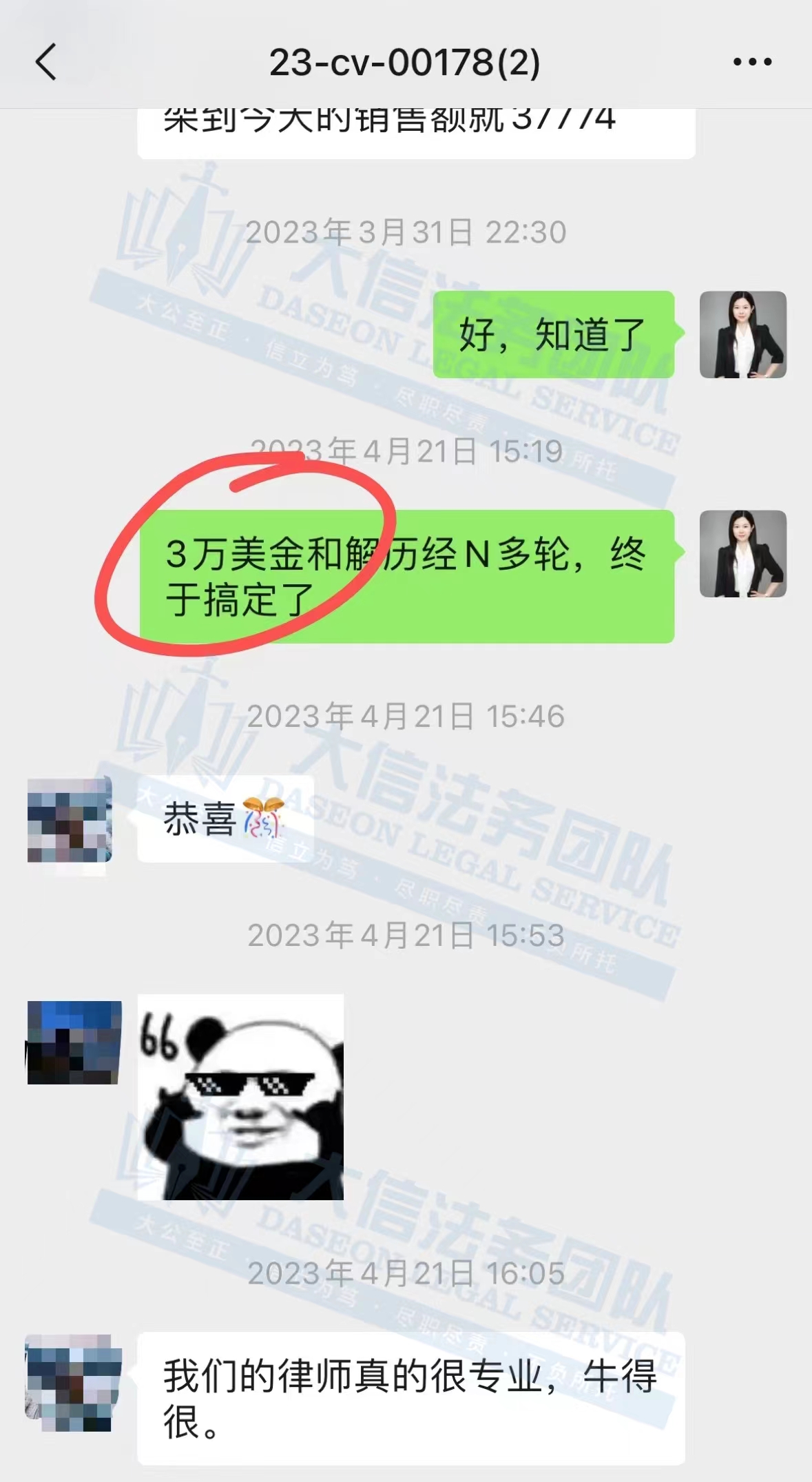 大信法务团队接手二次处理后,通过三轮博弈,据理力争,最终3万美金搞定,和解金比第一家降了15万美金,为客户挽回了上百万人民币的损失!解冻了150万美金,相当于一千多万人民币!