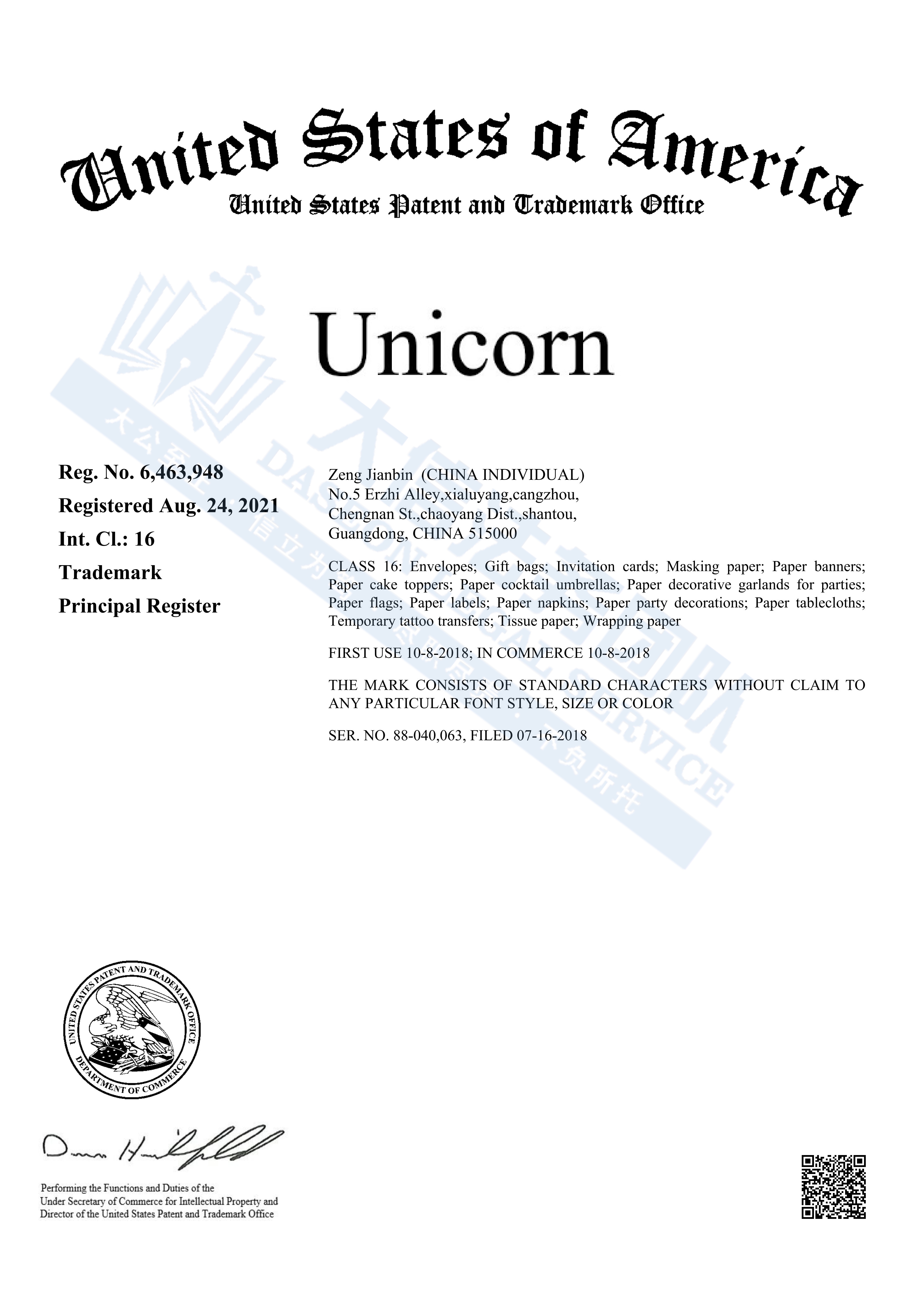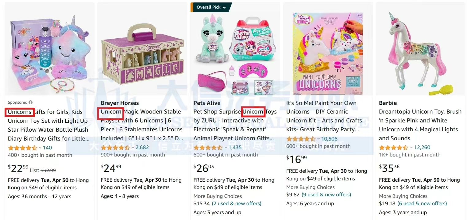 原告预计4.23向法院提交TRO禁令,在亚马逊上,有不少产品使用了Unicorn一词,注册范围是第16类:信封;礼品袋;邀请卡;纸面纸、纸横幅、纸蛋糕顶、纸鸡尾酒伞、纸派对装饰花环、纸旗帜;纸质标签,餐巾纸,纸质派对装饰;采购产品纸桌布,临时纹身转移,薄纸,包装纸。