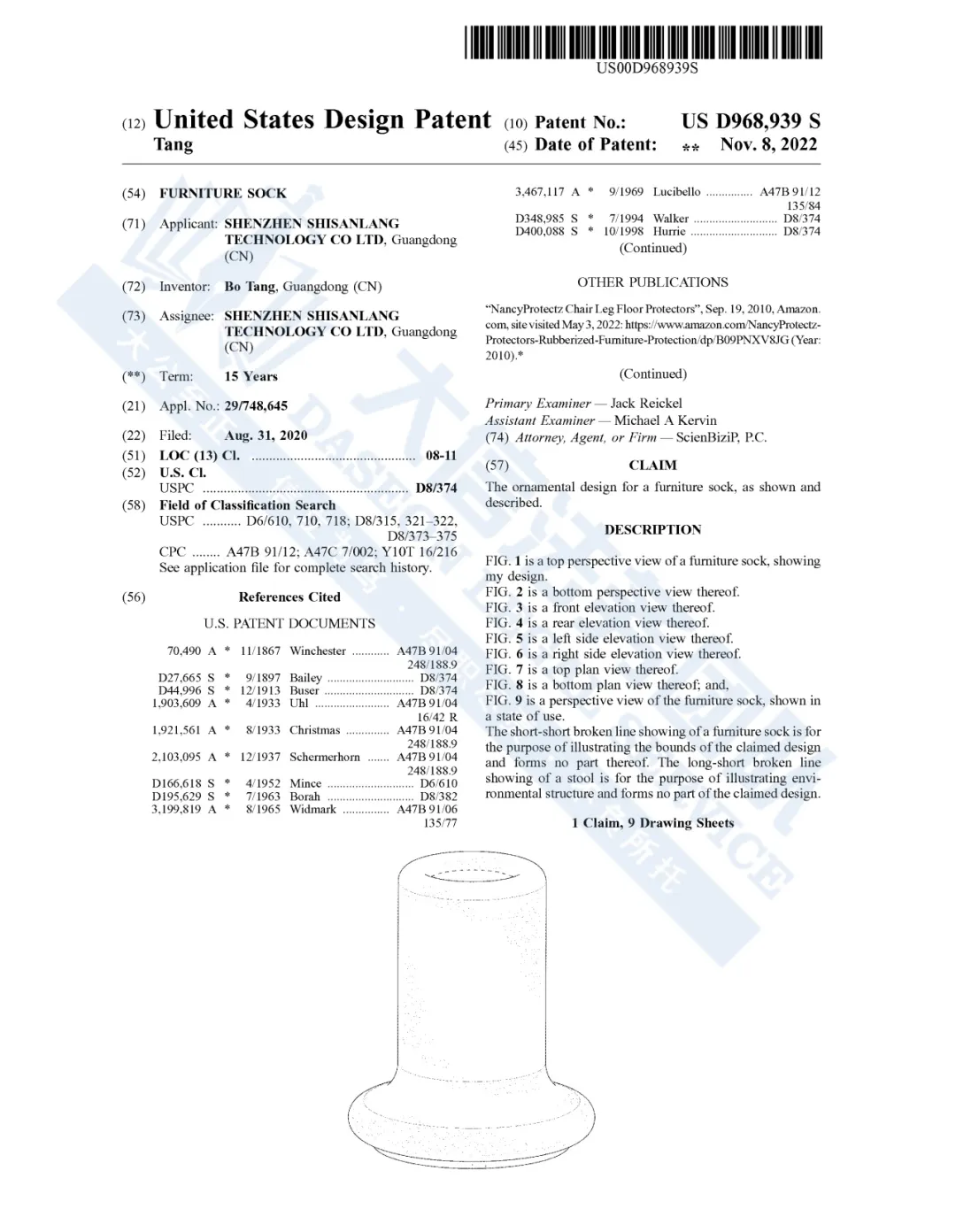 案件号:24-cv-03744 立案时间:2024年5月6日 原告:Shenzhen Shisanlang Technology Co Ltd 代理律所:LI and Yang 原告是深圳的一家公司,此次维权的产品是一款椅子脚套,用于覆盖凳子底部的脚部。它们可以保护地面,凳子脚套可以减少凳子底部与地面接触时产生的摩擦和噪音,防止地板被刮伤或损坏。特别是对于硬地板表面如木地板、瓷砖或地板,脚套可以减少凳子移动时对地板的磨损,防止滑动增加凳子在地面上的稳定性,防止凳子在使用过程中意外滑动或移动。还可以延长凳子的使用寿命,减少噪音。 本案涉及的专利如下: