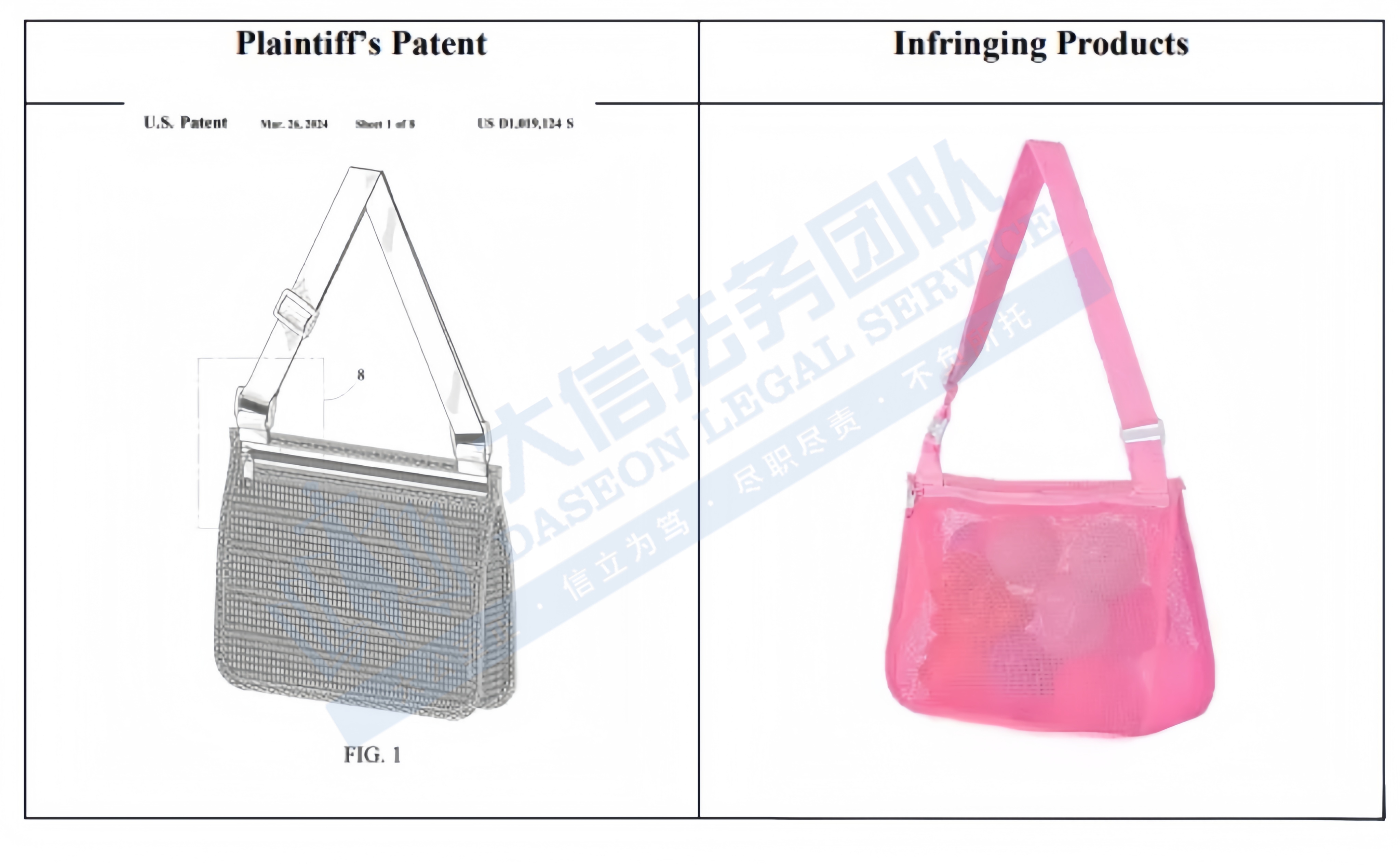 原告Zemiao Chen是来自于广东深圳的亚马逊卖家,网眼包产品的设计深受客户的喜爱。产品的外形由优质的皮革制成,可调节的肩带,可伸展的底部以便容纳更多的物品。产品展示如下: 案件分析 本案所涉及的专利如下,专利号为USD1019124S,下证日期是2024年3月26日。相关细节如下图所示: