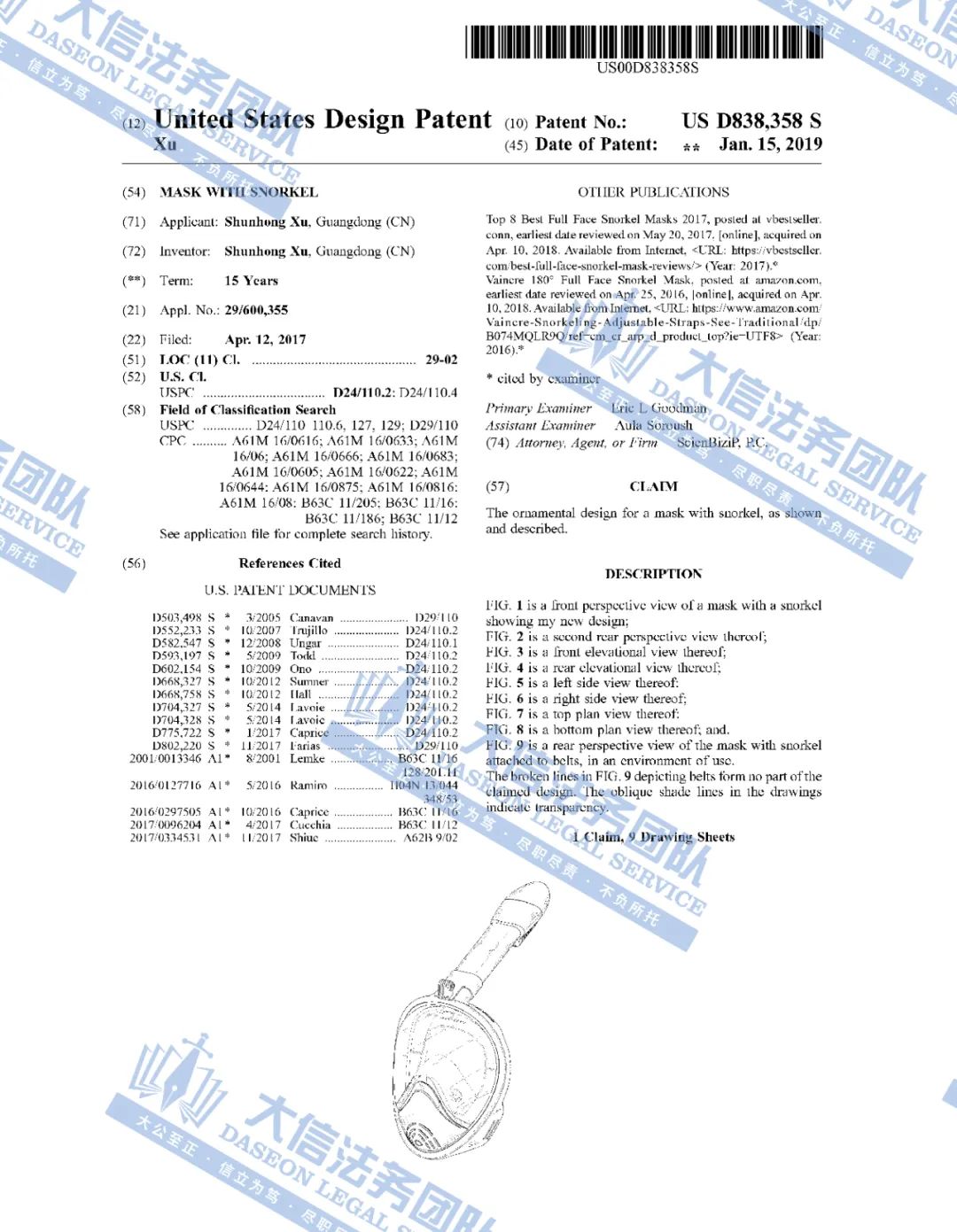 原告公司是国内专注开发户外旅游休闲产品的,此次发起维权的产品是K4单向外循环呼吸分离浮潜面罩,和其他浮潜装备不同,这款面罩还兼容运动相机,让用户在水下也能有更加优越的视野,同时还配备了独立的稀奇和呼气通道,以及防漏硅胶的密封面罩,有效防止面罩起雾以及盐水进入。