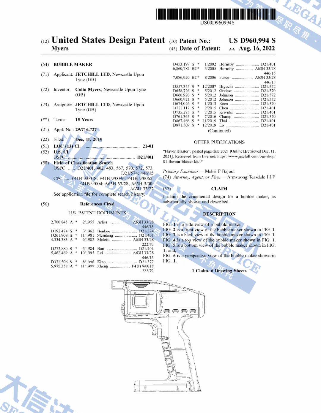案件分析 此案涉及了一项美国外观专利D888994S,专利具体信息如下,类似的产品都有侵权风险,卖家注意排查,避免侵权!