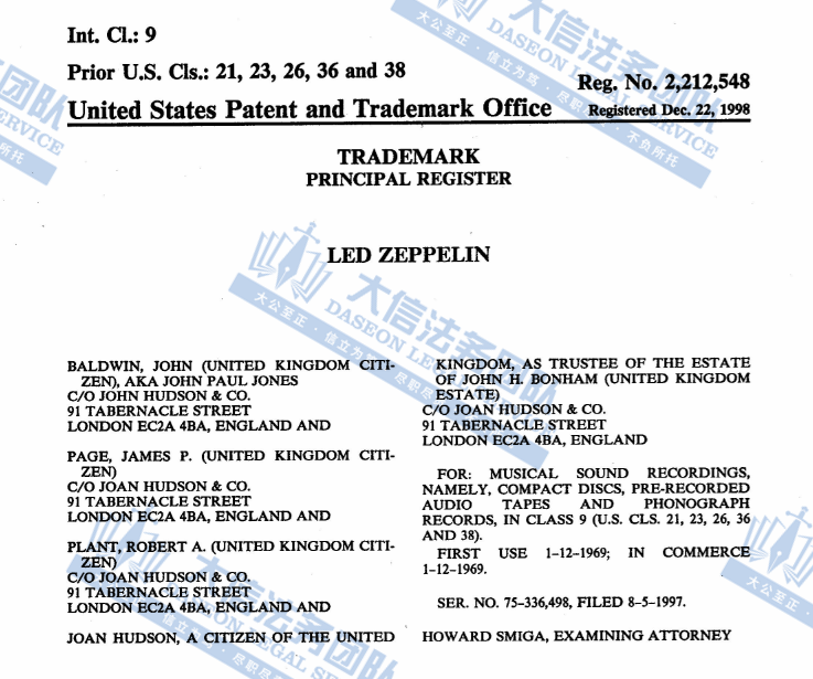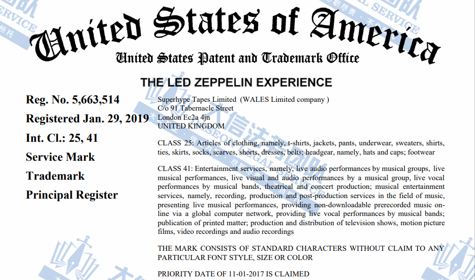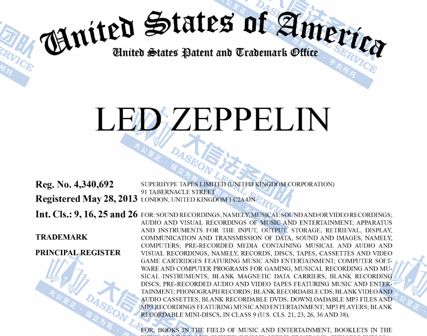 02 Led Zeppelin齐柏林飞艇乐队商标维权 案件号:24-cv-05408 立案时间:2024年6月27日 原告:Superhype Tapes Limited 代理律所:Tme Law, P.C. 原告介绍 原告Superhype Tapes, Ltd.是一家专业的录音、授权和出版机构,公司的持有人是齐柏林飞艇乐队的成员。齐柏林飞艇乐队(Led Zeppelin)是一支英国摇滚乐队,成立于1968年,他们的音乐融合了摇滚、蓝调、民谣和重金属等多种元素,影响了整个摇滚乐坛,众多专辑多次登顶美英音乐榜单。作为20世纪有巨大影响力的摇滚乐队之一,他们甚至可以说是重金属摇滚乐的创始人。所以齐柏林飞艇乐队的品牌产品,从服饰到周边商品,都深受粉丝的喜爱。