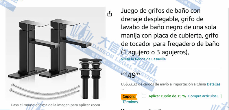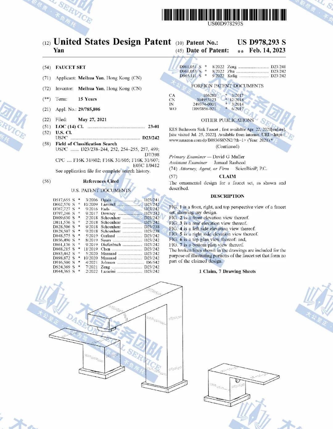 01 FAUCET SET 水龙头套装专利维权 案件号:24-cv-05403 立案时间:2024年6月27日 原告:Yan Meihua 代理律所:Davis & Carter LLC 原告介绍 原告Yan Meihua是来自香港的国人卖家,自2020年起,原告从事各种工业设计和产品设计、分销、营销等,主要在美国各地经营。这款浴室大洗手池专用水龙头套装,采用高品质的304不锈钢打造水龙头体,确保坚固耐用且不易生锈。无论是日常使用还是特殊需求,都能满足用户的需要。