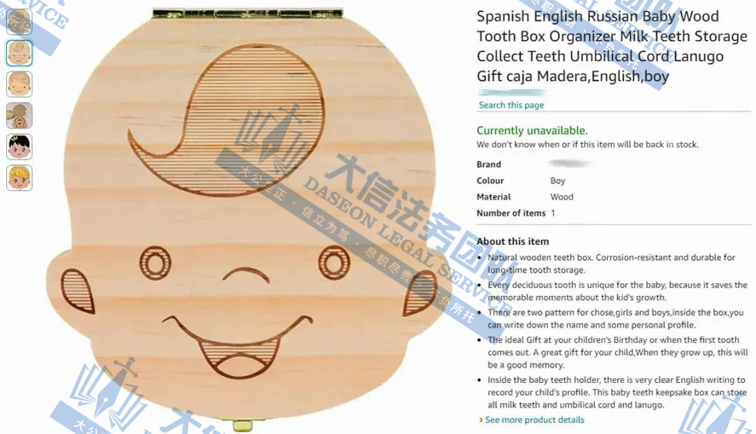 案件分析 此案涉及一款婴儿木制牙盒收纳盒产品的版权图片,侵权维权信息如下,请相关卖家注意自查!