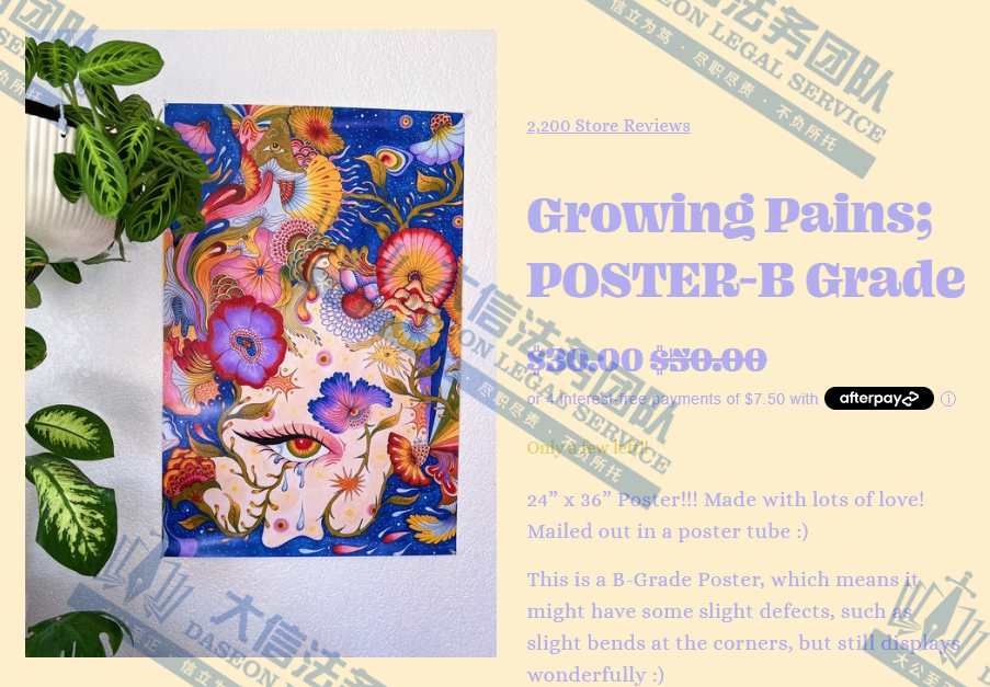 03 多彩艺术插画版权维权 案件号:24-cv-05268 立案时间:2024年6月24日 原告:Beverly Salas 代理律所:Law Office Of David Gulbransen 原告介绍 原告Beverly Salas是一位来自加利福尼亚州阿纳海姆的自学成才的艺术家,她的大部分作品都是由马克笔、水彩笔、丙烯颜料和彩铅绘制的。她擅长运用多彩的花朵、叶子和其他自然元素,将画面打造成充满活力和生命力的艺术品。不仅展现了她对自然之美的敏锐捕捉,还融入了她个人的情感与风格。每一幅作品都成为一件具有故事性和情感价值的艺术品。 案件分析 以下是此案所涉及的版权信息,除了以下作品,Beverly Salas的其它作品都不能随意使用,否则会有侵权风险。作品创作之初便受到版权保护,相关卖家速速排查,尽快下架,以减少损失!