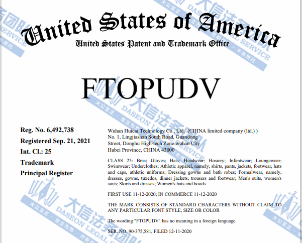 案件分析 此案所涉及FTOPUDV和Xarfik商标维权,注册在第25大类,涵盖服装、鞋类、帽类及相关配件,如围巾、手套、袜子、腰带等。以下为原告注册商标信息,未经授权不能随意使用,侵权风险极大!