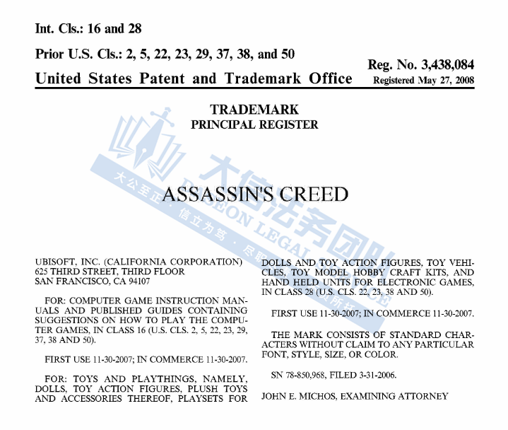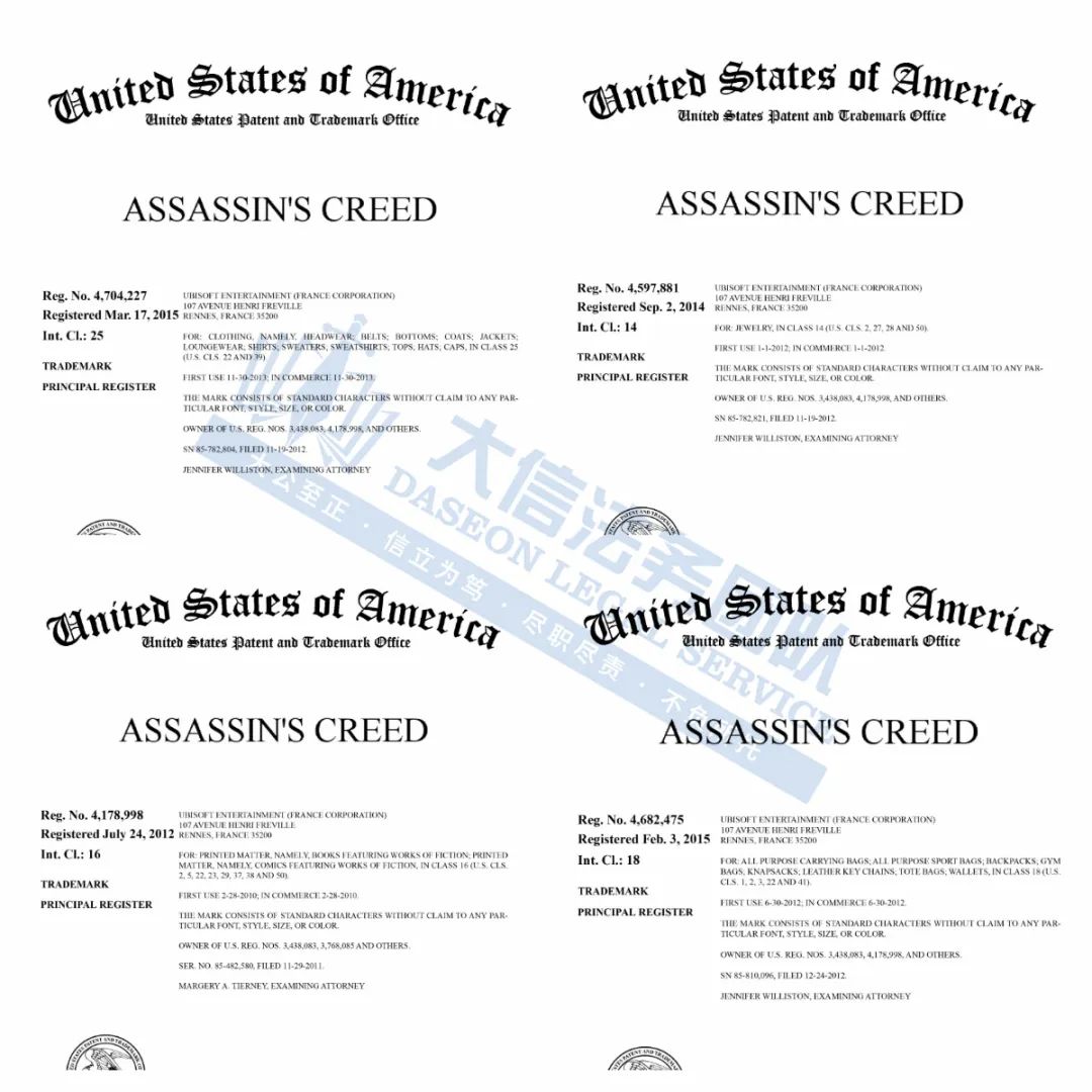 02 ASSASSIN’S CREED 刺客信条商标维权 案件号:24-cv-05379 立案时间:2024年6月27日 原告:Ubisoft Entertainment, S.A. and Ubisoft, Inc. 代理律所:HSP 原告介绍 原告Ubisoft, Inc公司,专注于开发、发行与经销互动式娱乐游戏与服务,ASSASSIN’S CREED 刺客信条是由该公司开发和发行的同名商标电子游戏,于2007年发布。自那时以来,刺客信条已经发布了超过12款主要系列视频游戏,在全球范围内售出了超过1亿份,使刺客信条成为有史以来最畅销的视频游戏系列之一。刺客信条品牌的产品已扩展到视频游戏以外的各种其他媒体,包括:电影、小说、漫画书、玩具、服装和其他类型的产品。