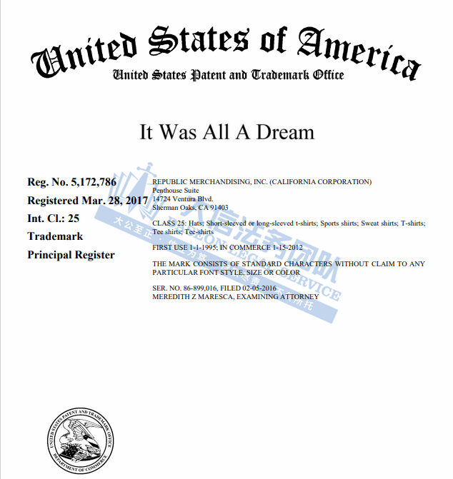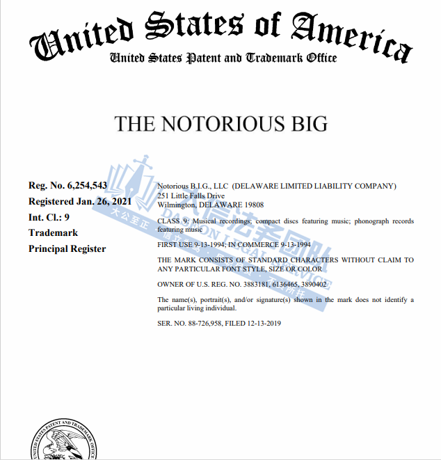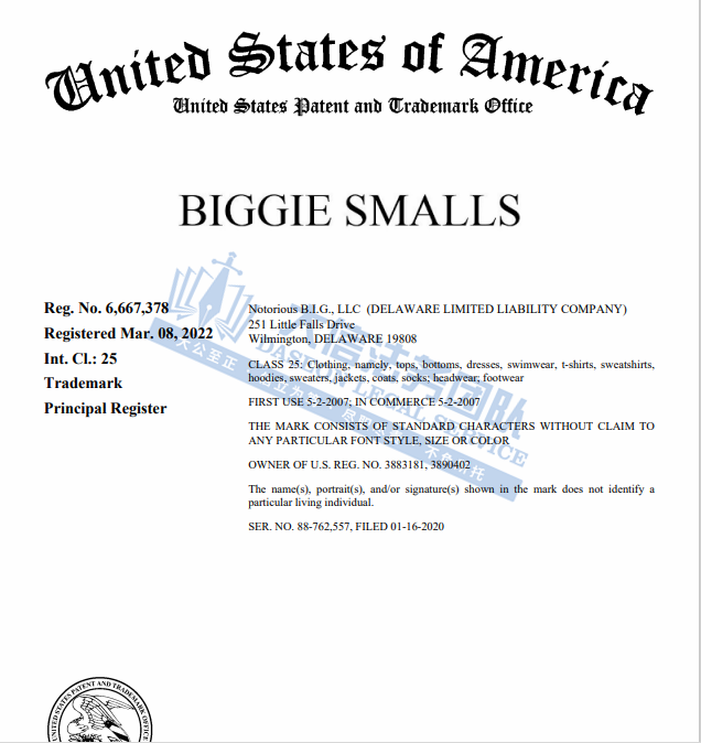 03 嘻哈音乐人The Notorious B.I.G.商标 案件号:24-cv-05935 立案时间:2024年7月16日 原告:Merch Traffic, LLC 代理律所:GBC 原告介绍 原告The Notorious B.I.G.中文名字为:声名狼藉先生,原名Christopher Wallace,是美国著名的嘻哈音乐人。代表作品:《准备好去死》、《死后的生活》(Life After Death)等。其中,《死后的生活》在他去世后16天发行,销量登顶当时美国唱片销量榜榜首,并在2000年获得钻石级销量认证,其专辑在美国地区销量达1700万张。他对后来的说唱歌手产生了深远的影响,包括 Jay-Z、Nas 和 Tupac Shakur。他被认为是有史以来最伟大的说唱歌手之一,并获得了格莱美奖和 MTV 音乐录影带奖等众多奖项。