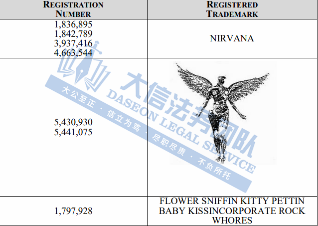 03 Nirvana 涅槃乐队商标维权 案件号:24-cv-06119 立案时间:2024年7月19日 原告:Merch Traffic, LLC 代理律所:GBC 原告介绍 原告美国传奇摇滚乐队,成立于1987年,乐队先后发行多张席卷全球的大热唱片,歌迷遍布世界各地。据统计,截止2016年,Nirvana的唱片总销量超过了7500万张。乐队品牌亦有多个注册商标,包括本名NIRVANA的文字商标,著名专辑封面图案等。Nirvana的成功普及了另类摇滚,他们经常被称为X世代的傀儡乐队,有着狂热的追随者,对现代摇滚有着很大的影响。 官网:https://www.nirvana.com/